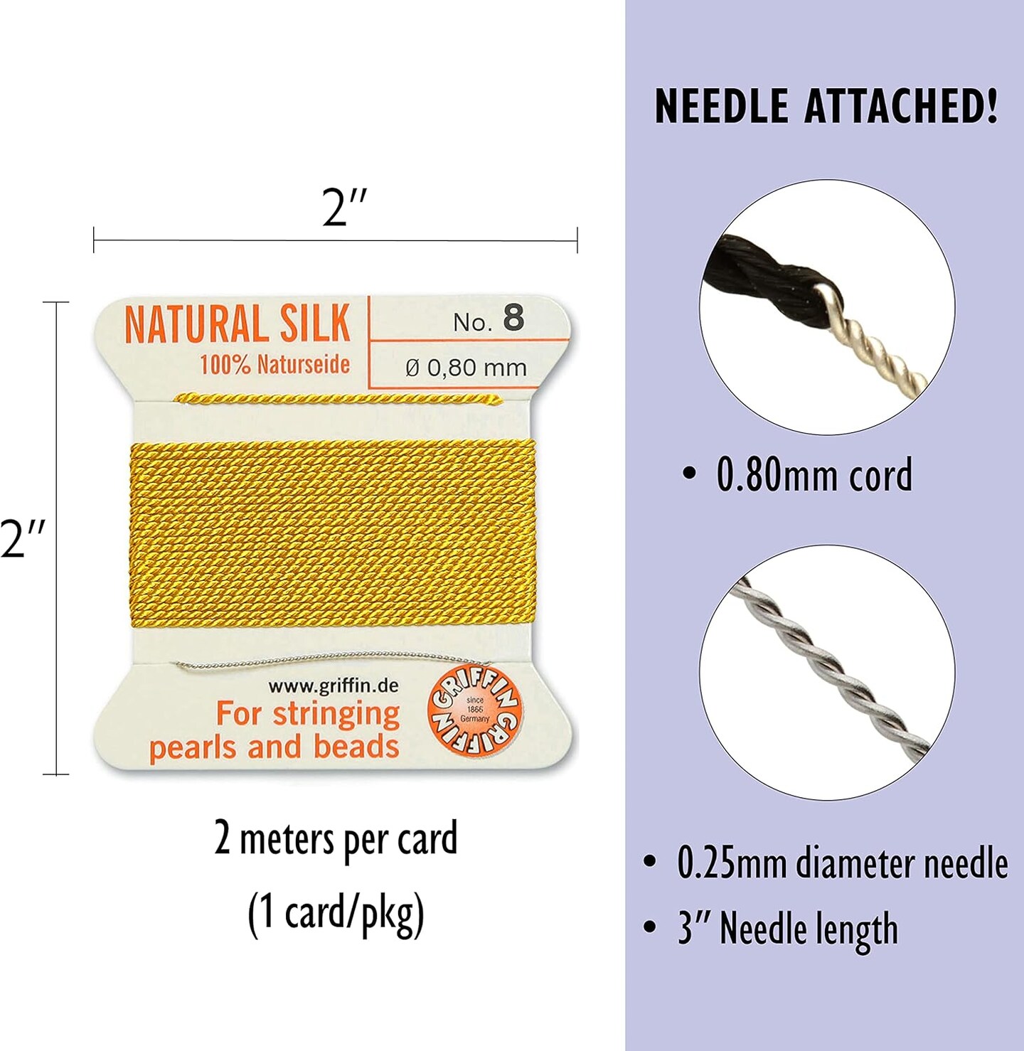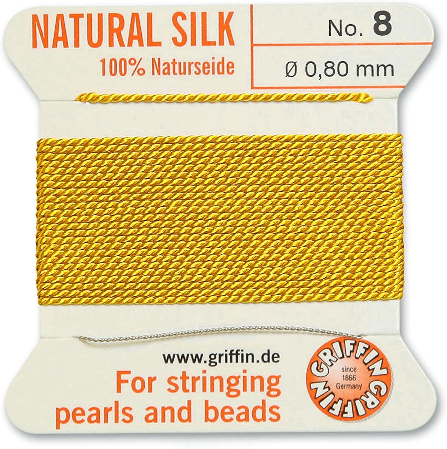 Griffin Silk Bead Cord Perlseide – Size 8 (0.80mm) – 2 Meters per Card – Stainless Steel Needle Attached – for Knotting Pearls, Gemstones, Crystals and Beads