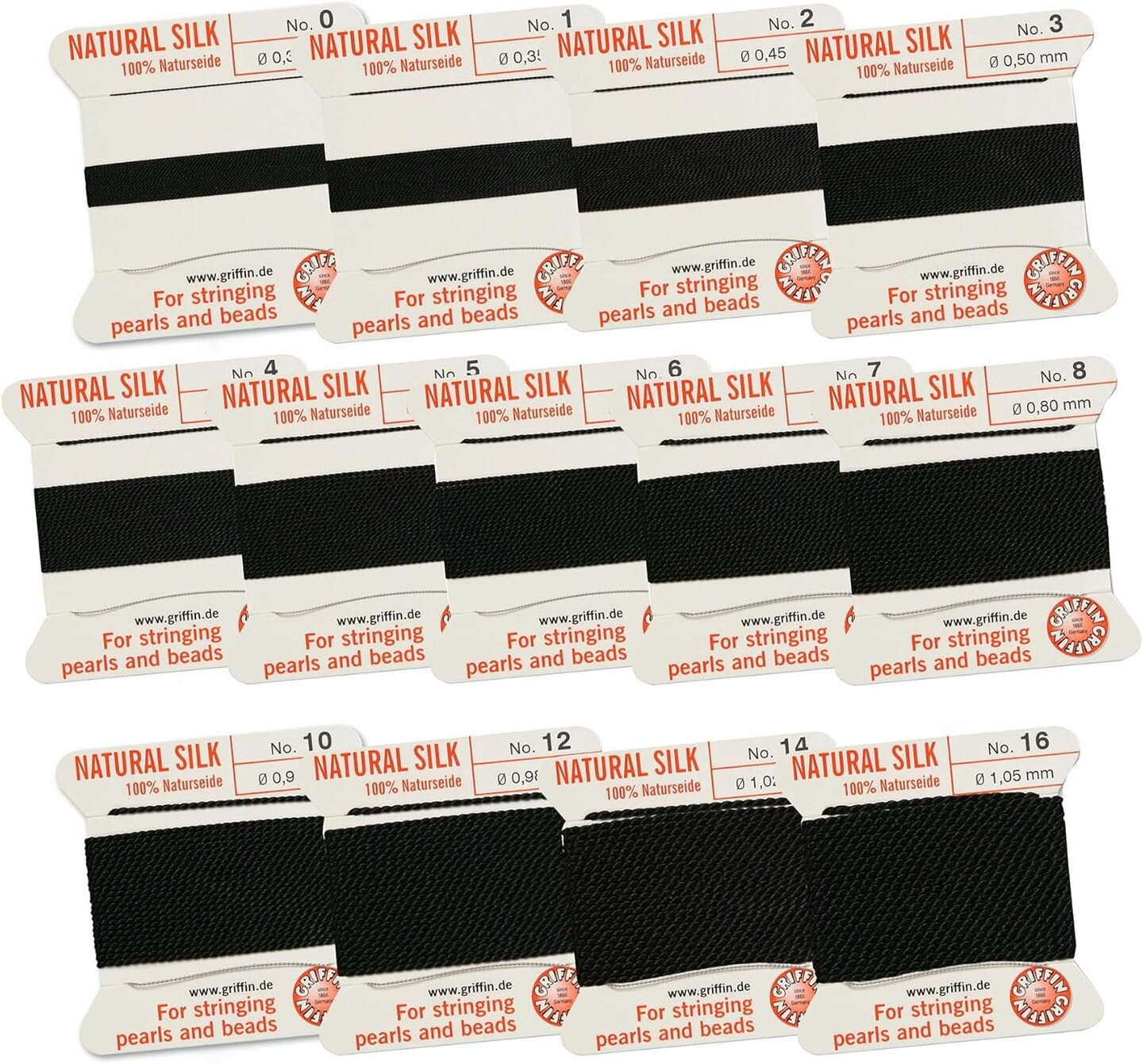 Griffin Silk Bead Cord Perlseide – Size Assortment 0-16 – 2 Meters per Card – Stainless Steel Needle Attached – for Knotting Pearls, Gemstones, Crystals and Beads
