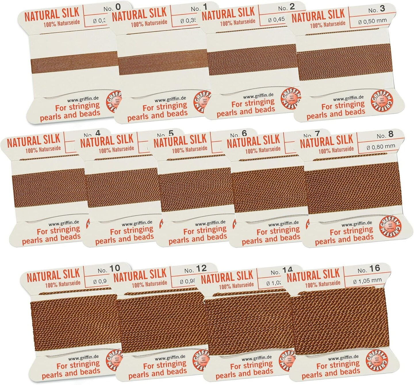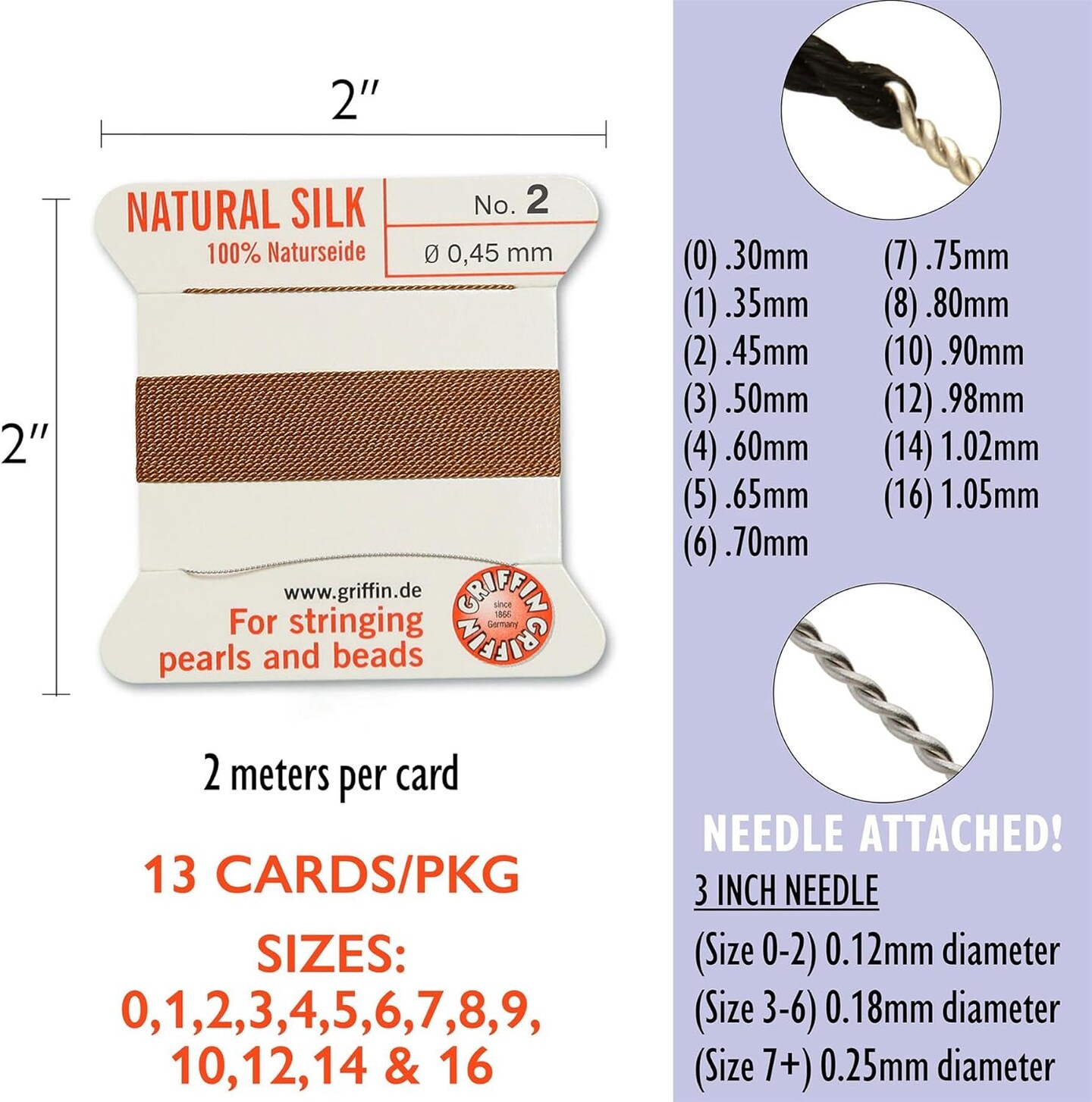Griffin Silk Bead Cord Perlseide – Size Assortment 0-16 – 2 Meters per Card – Stainless Steel Needle Attached – for Knotting Pearls, Gemstones, Crystals and Beads