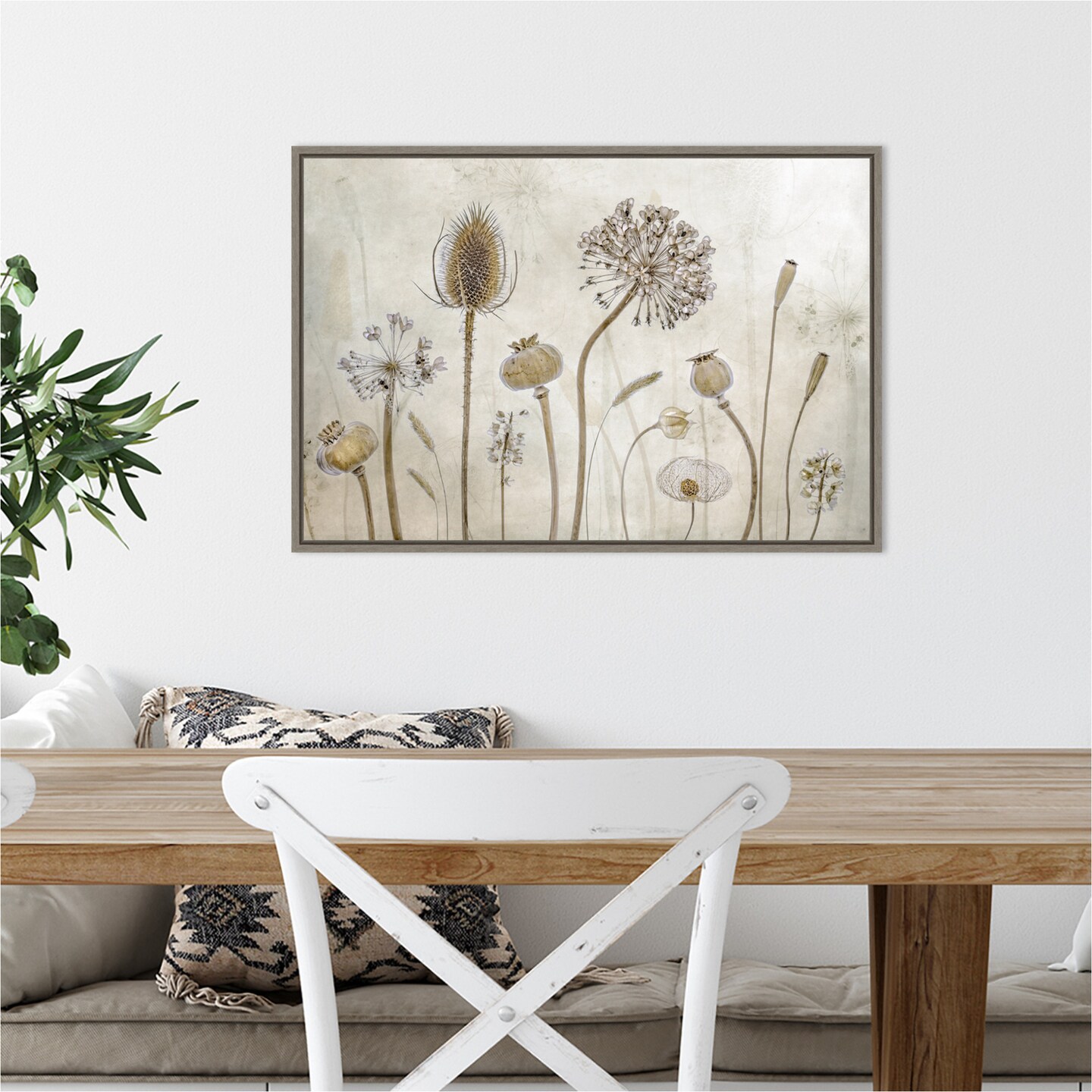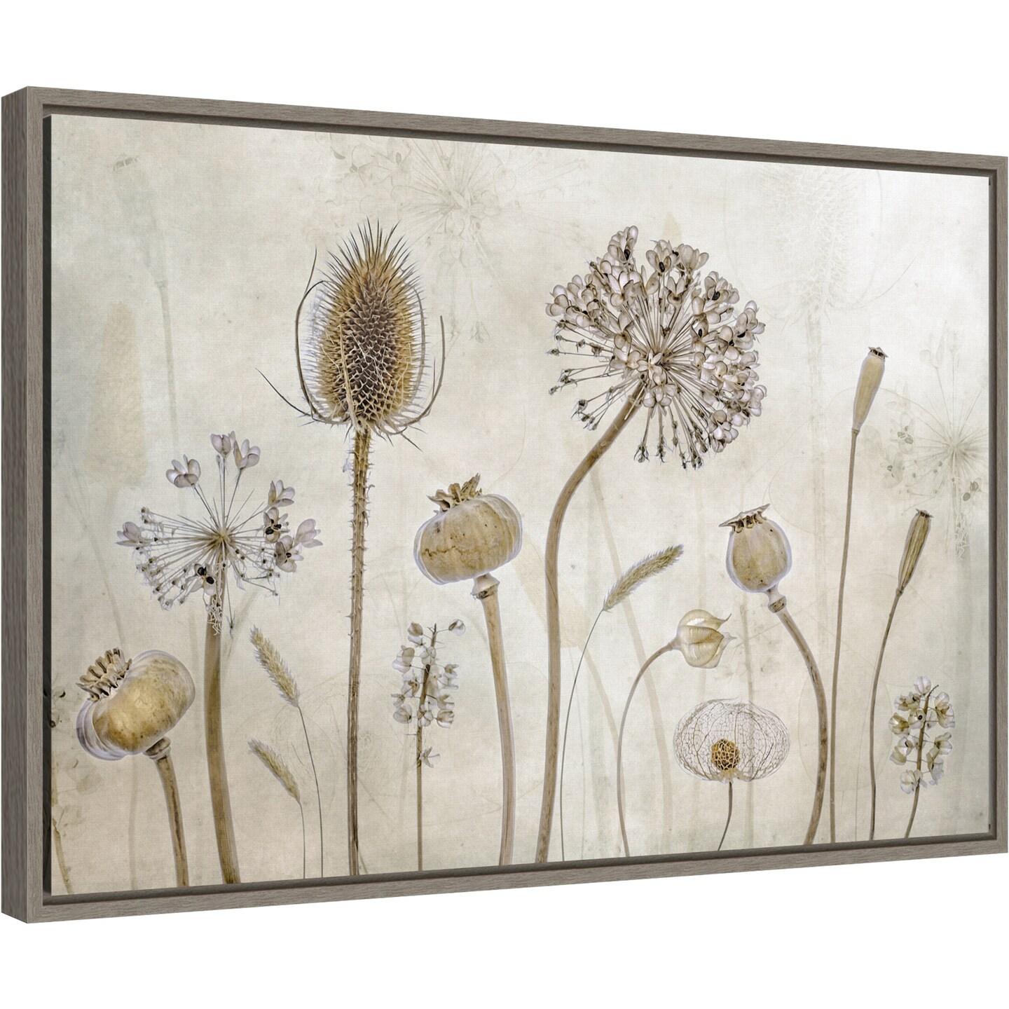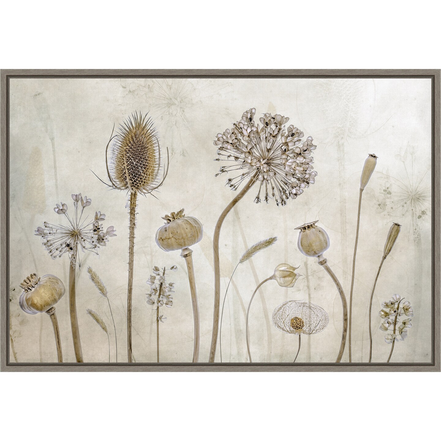 Growing old (Floral seed pods) by Mandy Disher 23-in. W x 16-in. H. Canvas Wall Art Print Framed in Grey