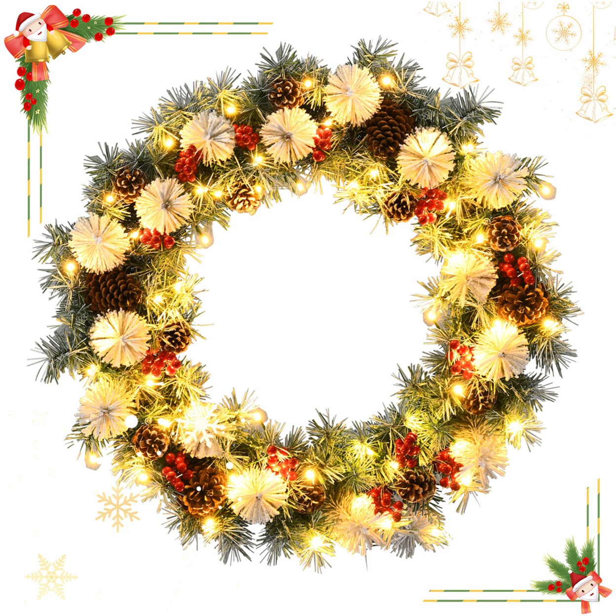 Gymax 30'' Pre-lit Artificial Snow Flocked Christmas Wreath w/ 50 LED Lights