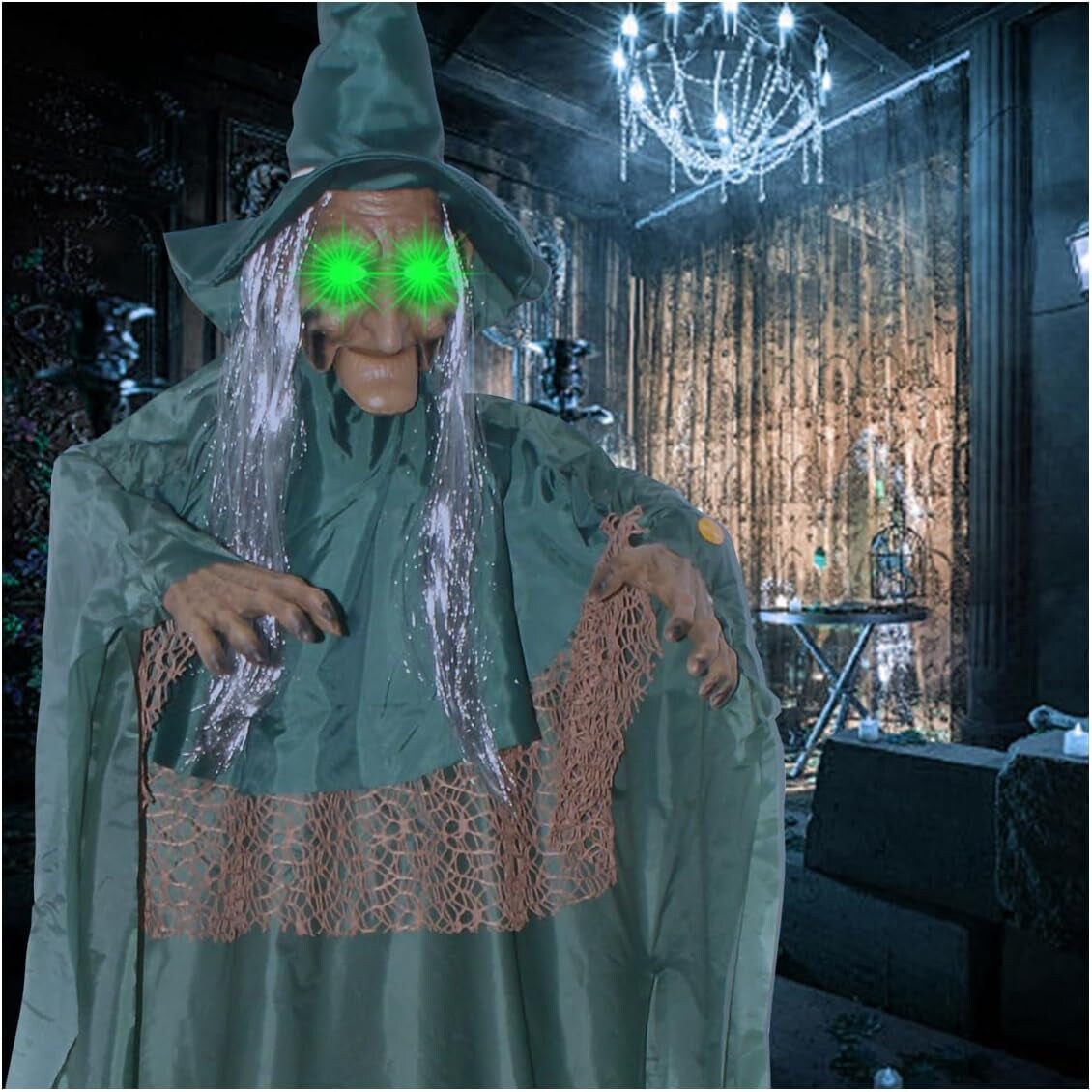 Halloween Animatronics Decoration Indoor and Outdoor, 67" Animated Halloween Witch with Sound Activation and Light up Eyes, Life-Size Hanging Talking Witch, Adjustable Arms (Green)