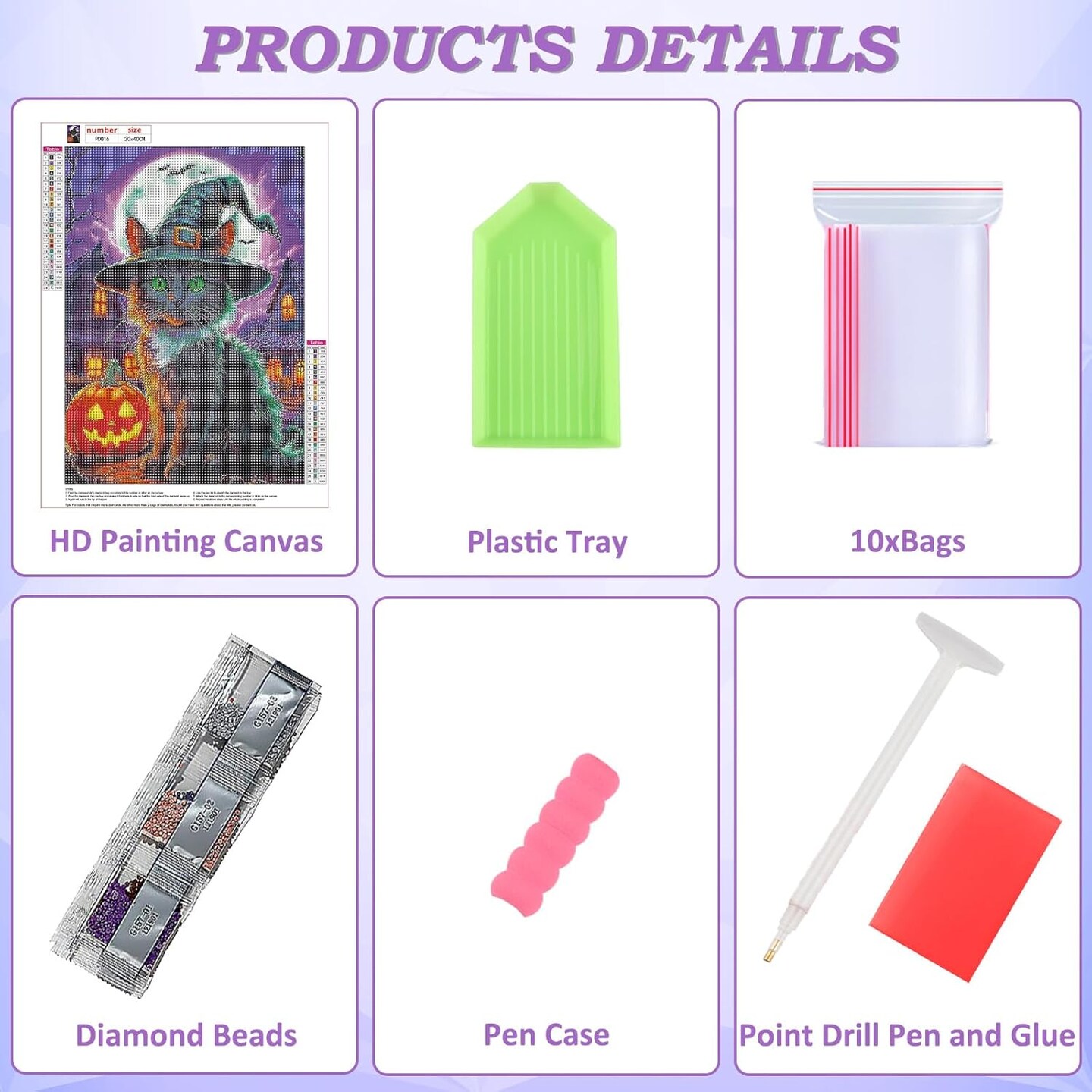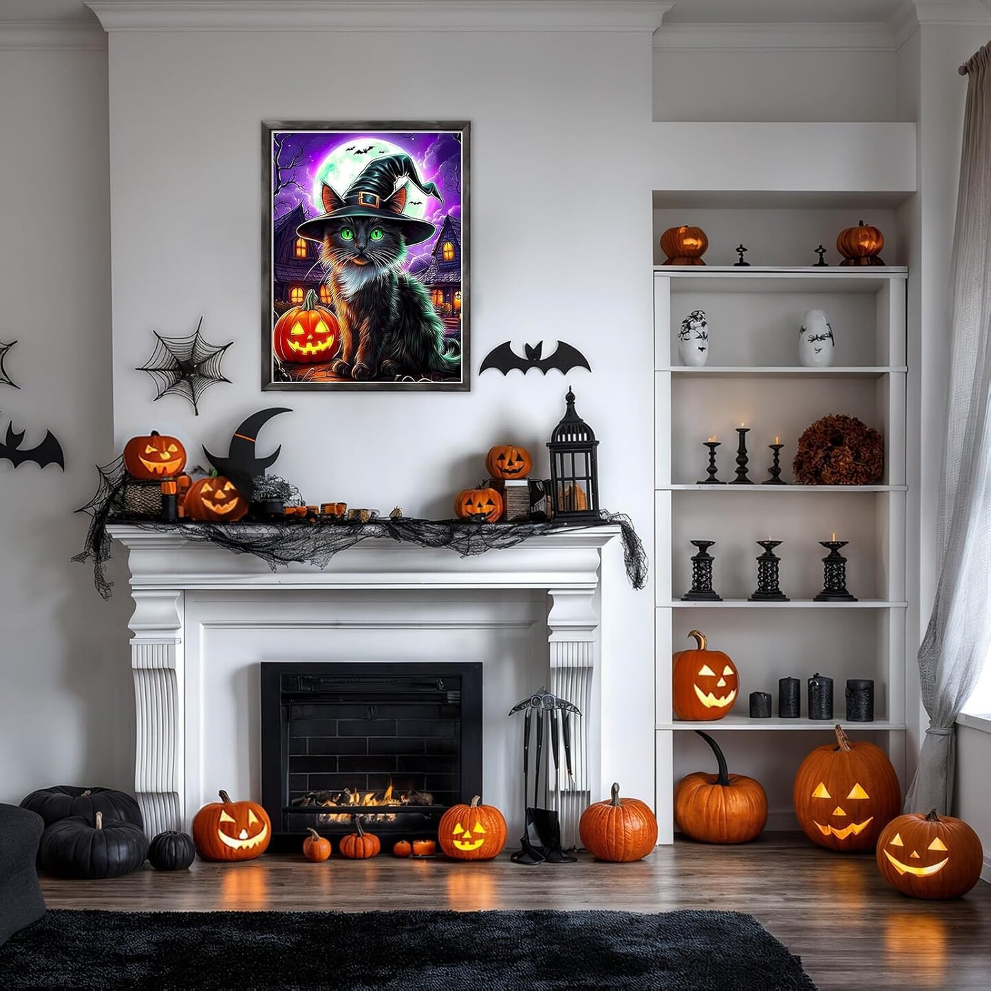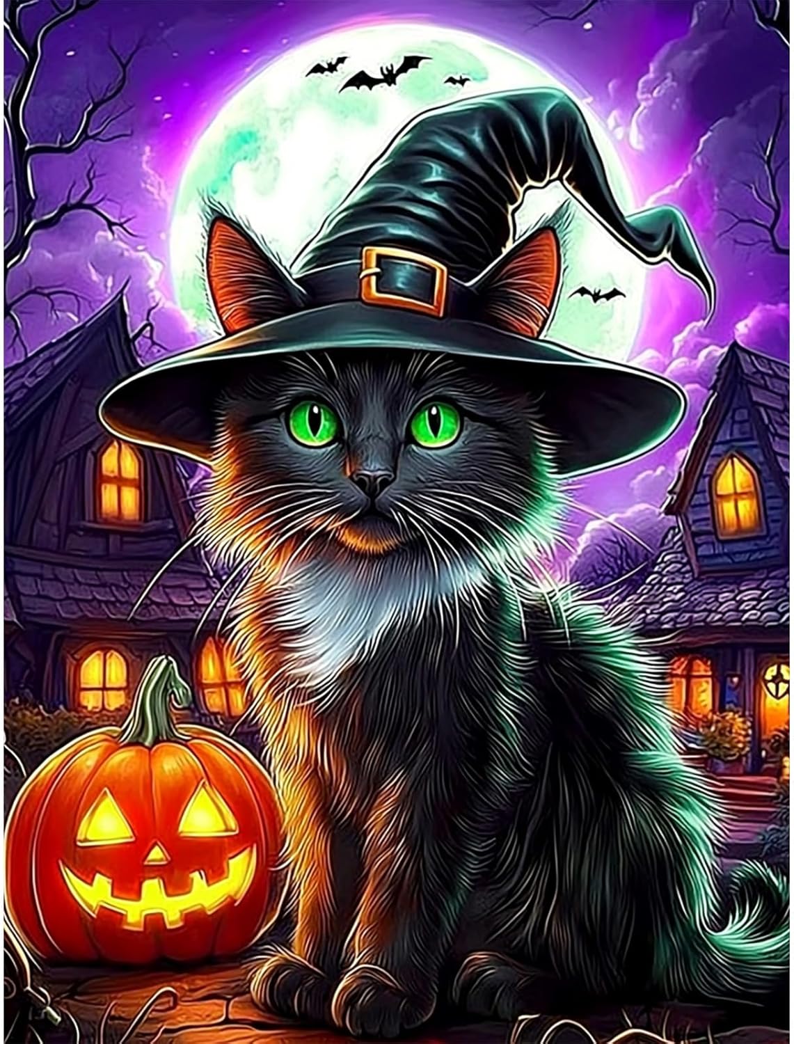 Halloween Black Cat 5D Diamond Painting Kit – Full Round Drill DIY Gem Art for Adults, 12x16 Inch Wall Décor