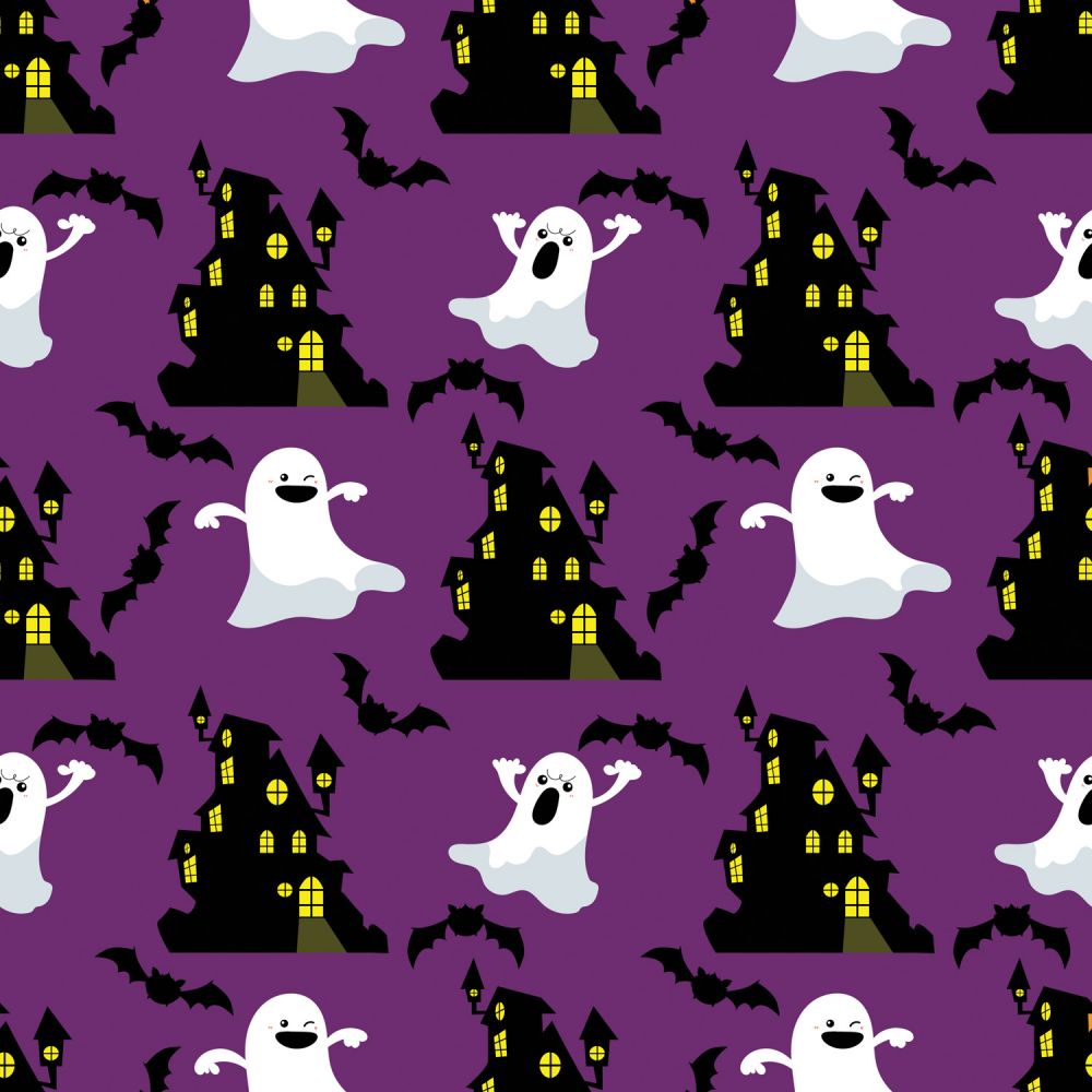 Halloween Ghosts and Haunted House on Purple 100% Cotton Fabric