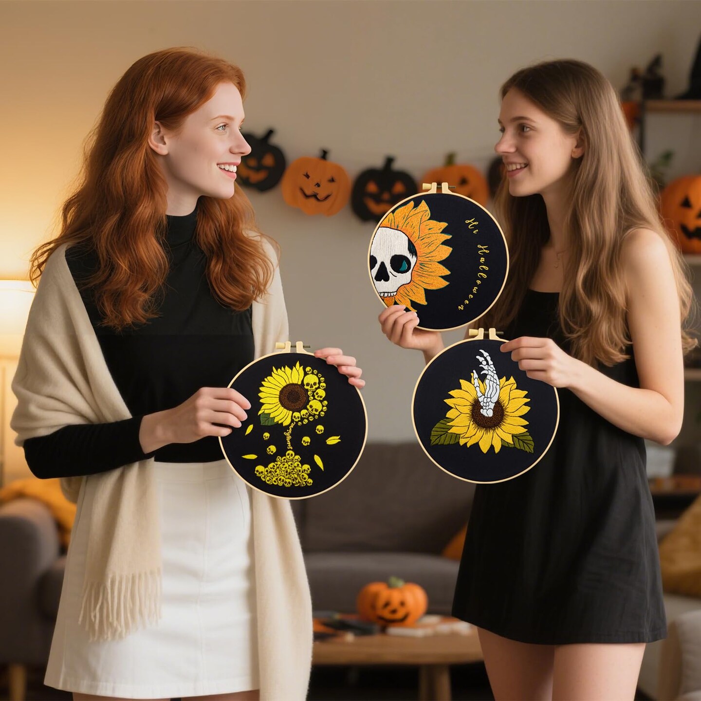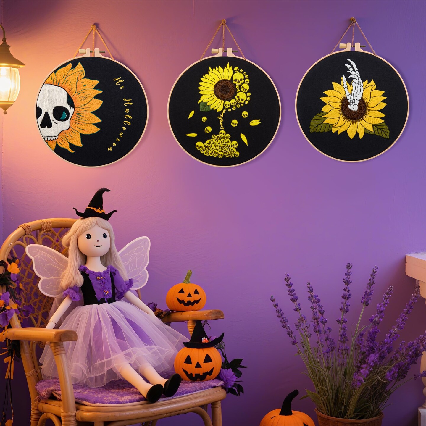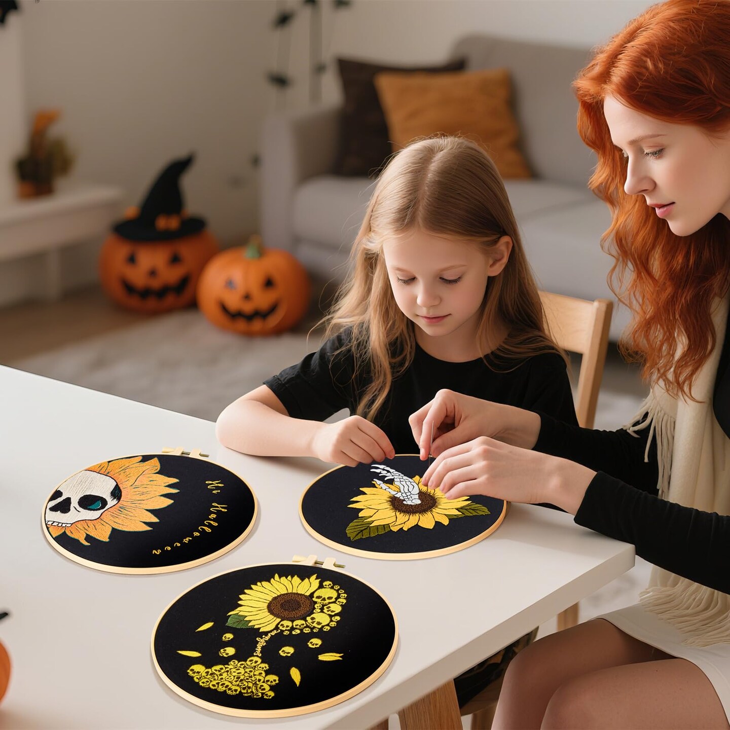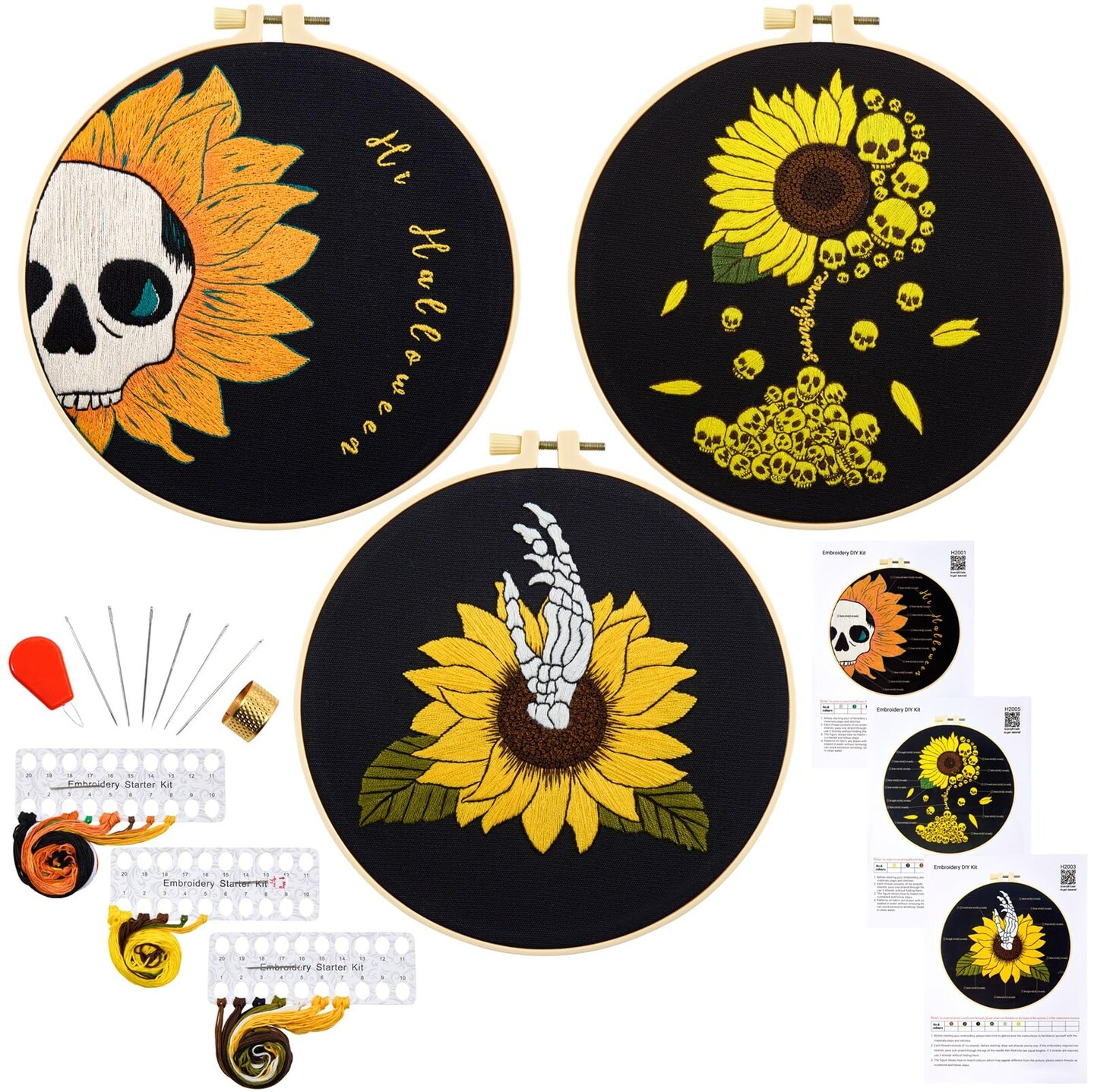 Halloween Gothic Embroidery Kits for Beginners Adults, Skull Hand Embroidery Needlepoint Kits, Sunflower Stamped Cross Stitch Kits for Beginners Adult, 3 Set Embroidery Hoops (Attached Video Tutorial)