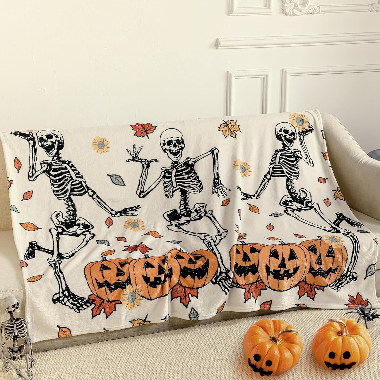 Halloween Throw Blanket Cute Dancing Skeleton Soft Blanket Pumpkin Throw Blanket Fall Leaves Cozy Blankets Halloween Decoration for Sofa Bed Holiday Party Gifts,50"X60"