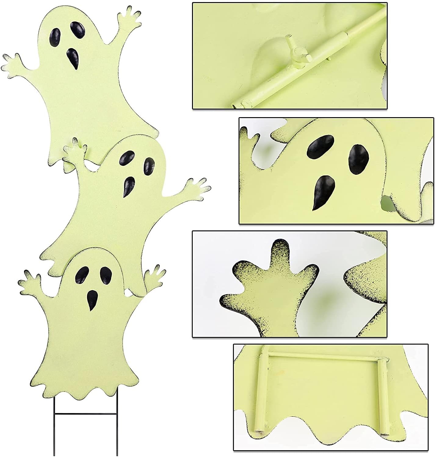 Halloween Yard Stake, 38.6" Glow in The Dark Metal Stacked Ghost with Green