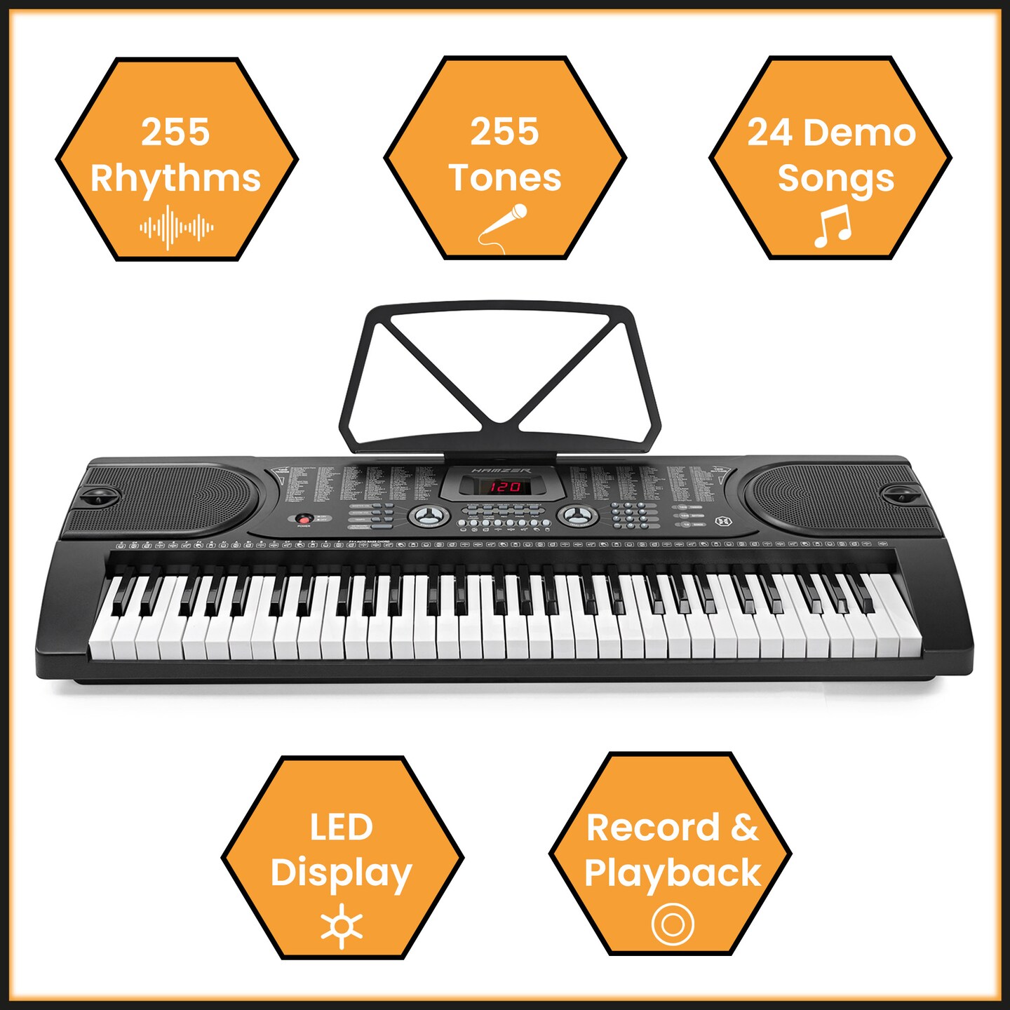 Hamzer 61 Key Electric Keyboard Piano with Stand for Beginners, Portable Digital Piano Keyboard Set with Built-In Speakers, Microphone, Keynote Stickers