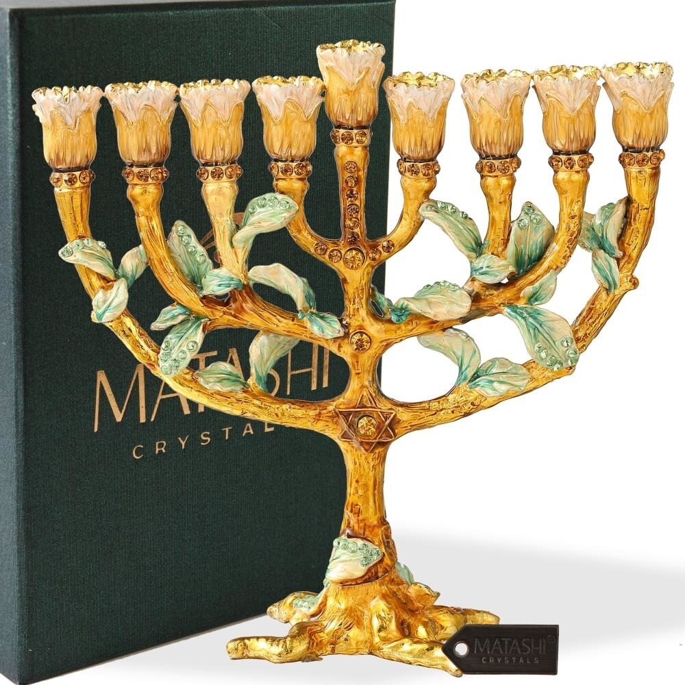 Hand Painted Enamel Menorah Candelabra With A Tree And Flower Buds Design And Embellished With Gold Accents And Fine