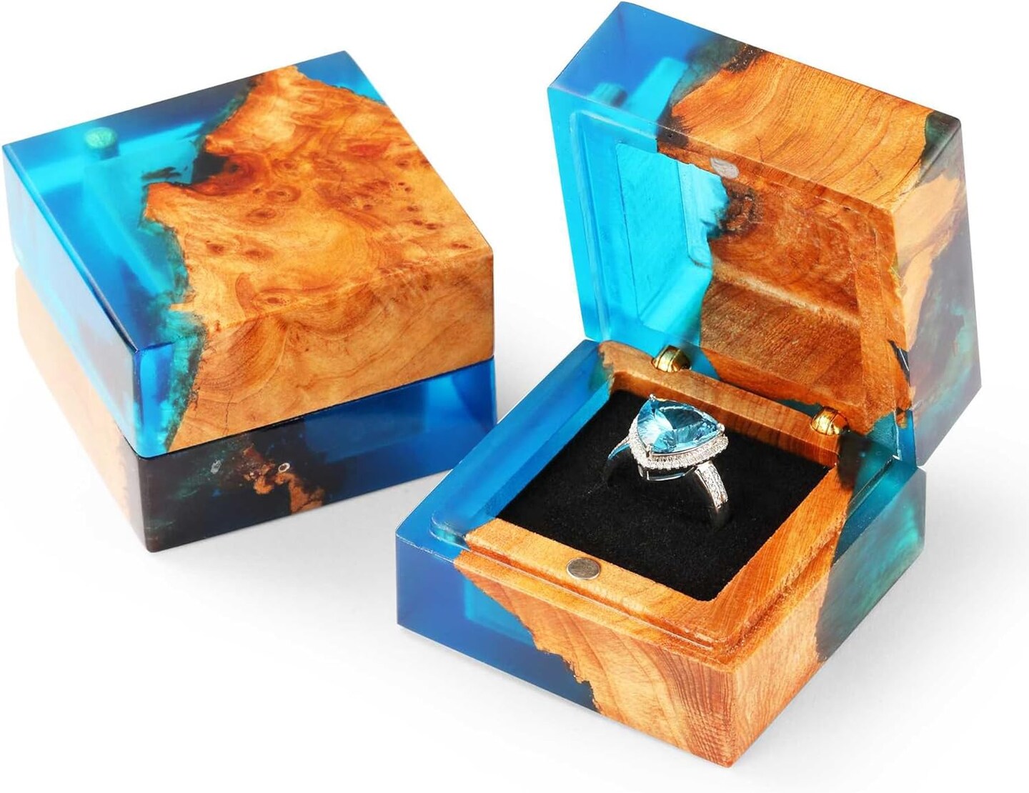 Handcrafted Blue Wedding Engagement Ring Box – Single Slot Wooden & Resin Proposal Box for Ceremony