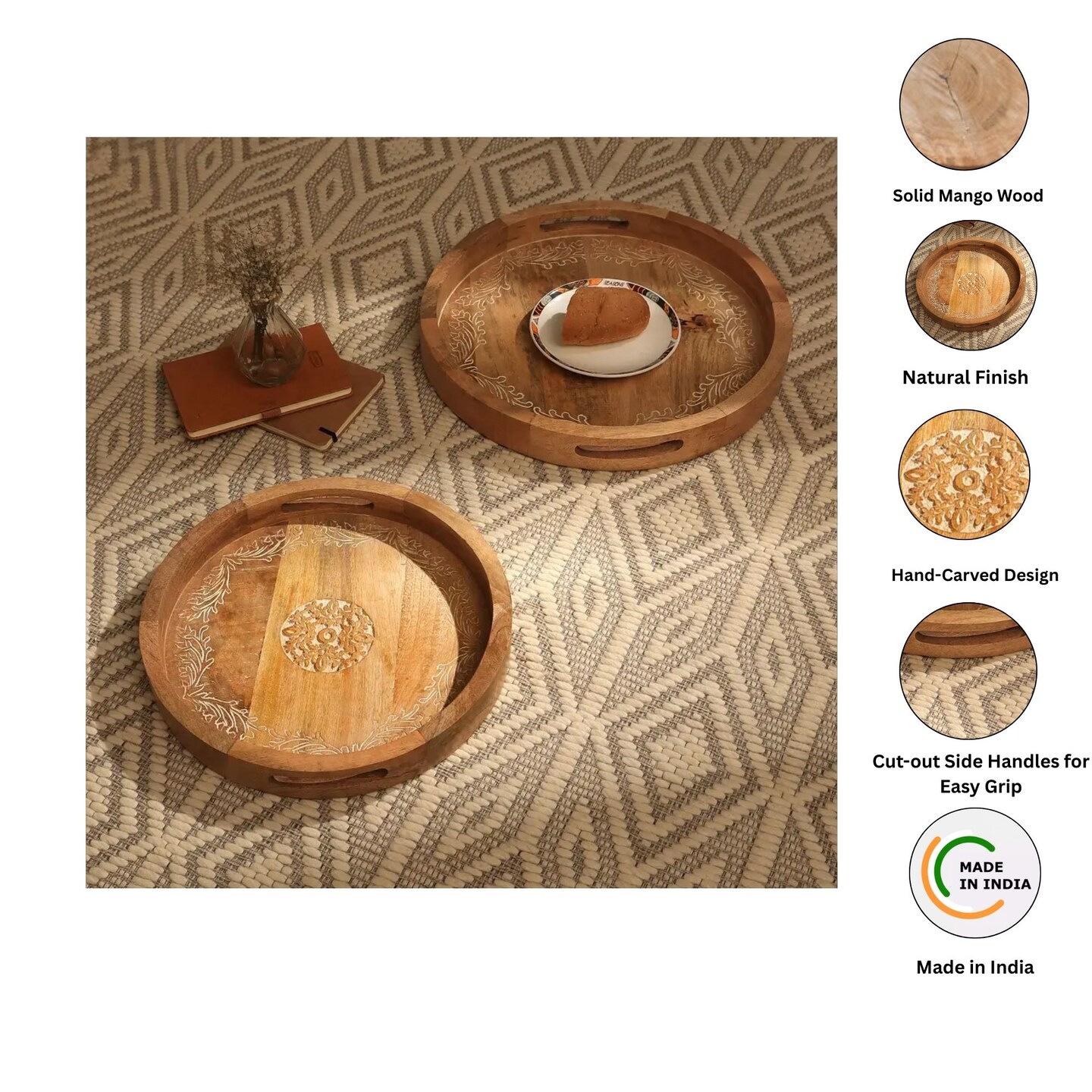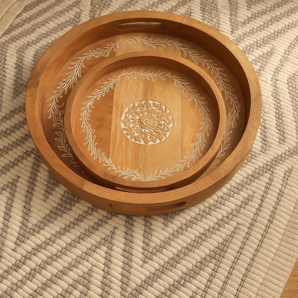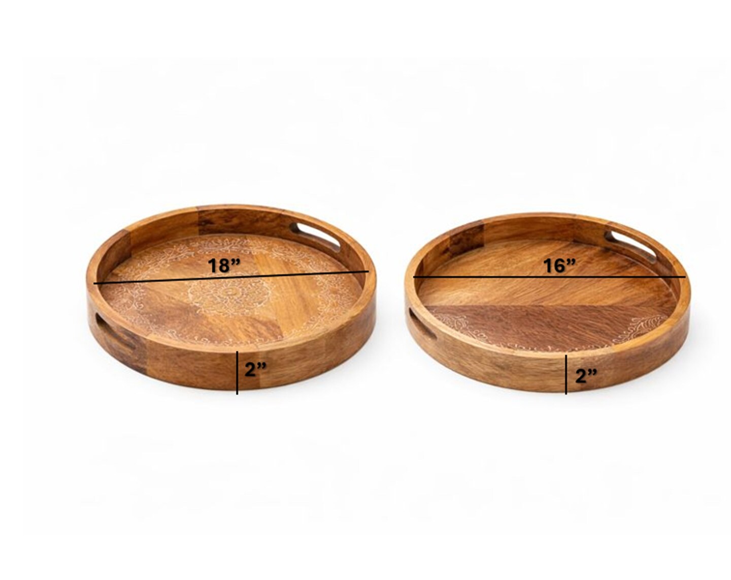 Handcrafted Round Wooden Serving Tray – Rustic Engraved Decorative Tray| Set of 2
