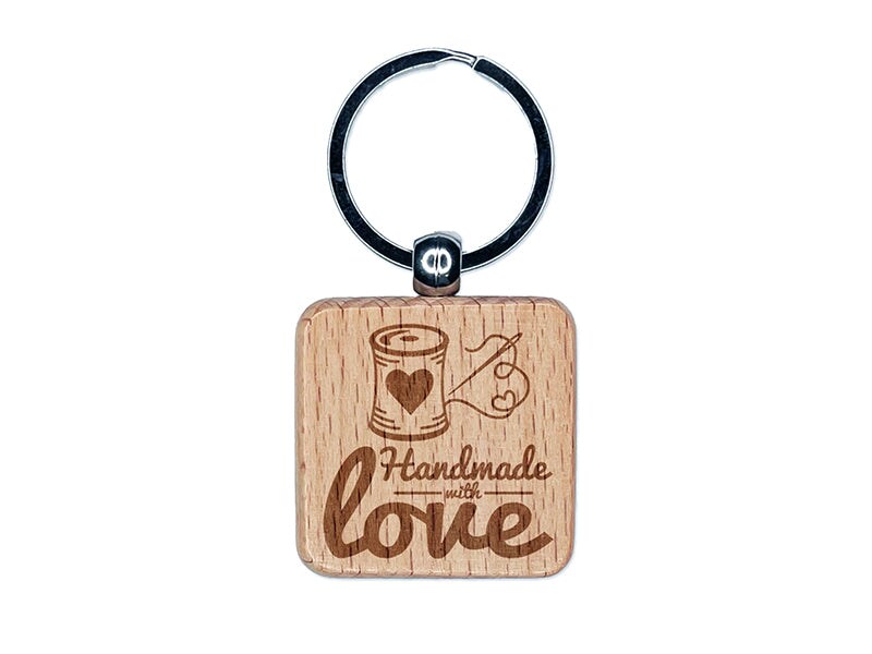 Handmade With Love Sew Sewing Thread Spool Engraved Wood Square Keychain Tag Charm