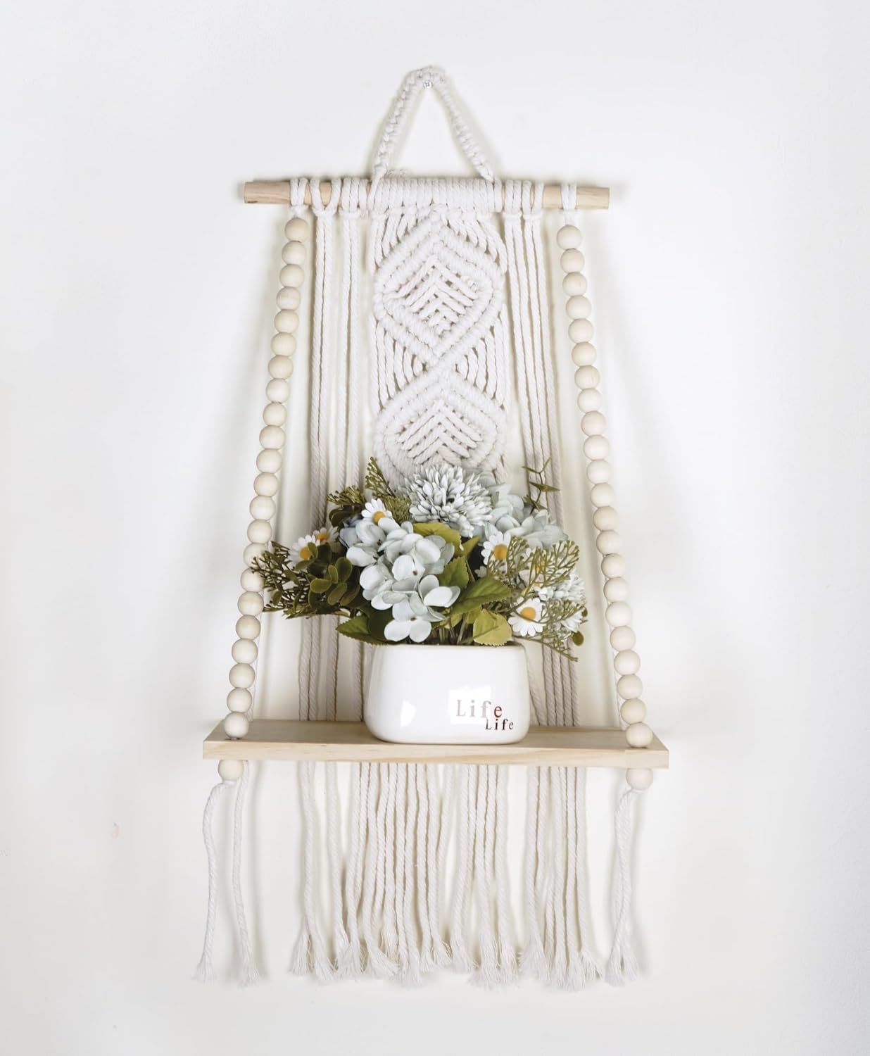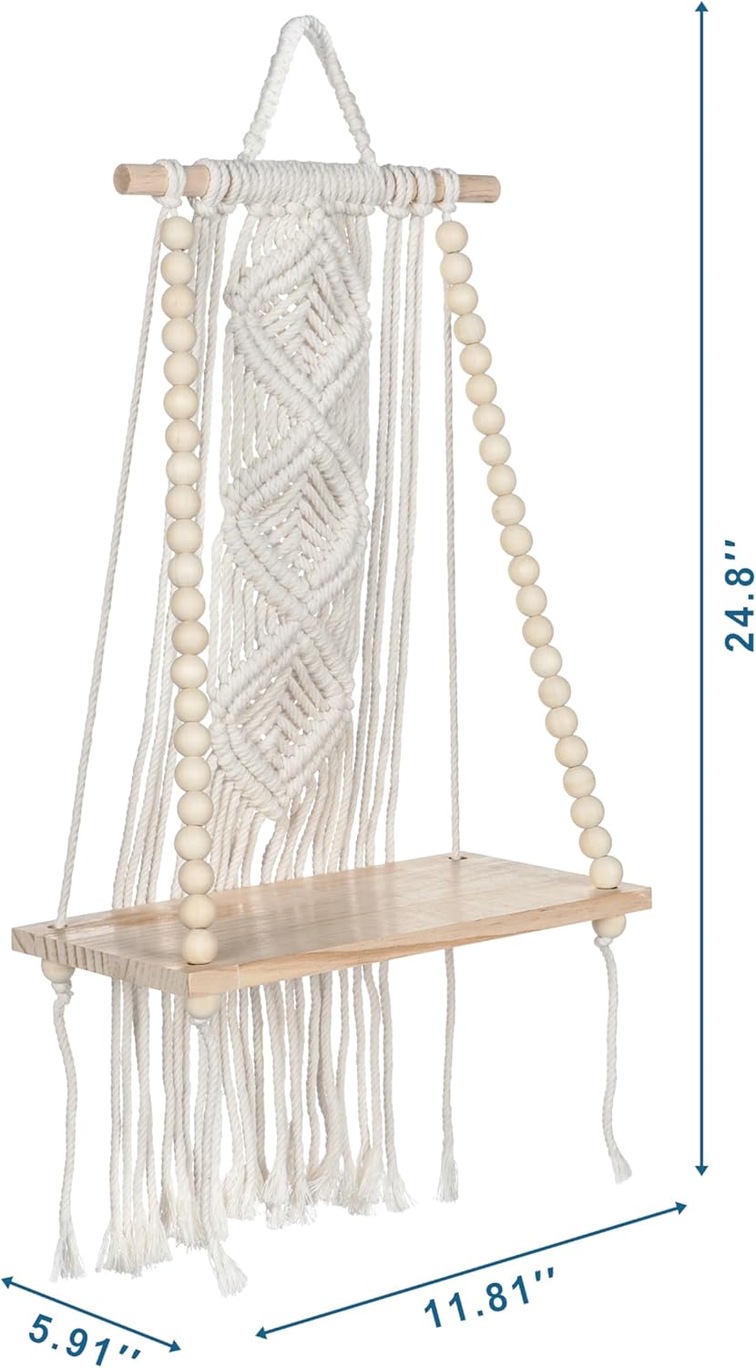 Handmade Wooden Macramé Wall Hanging with Shelf – Sturdy Beaded Rope for Plants & Home Décor – Modern Boho Wall Decoration for Living Room & Interior Design