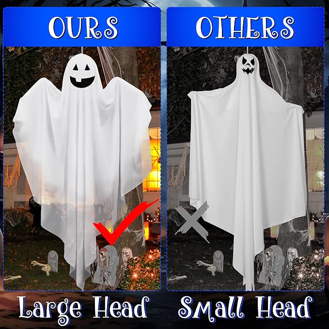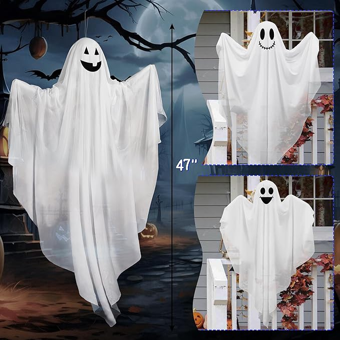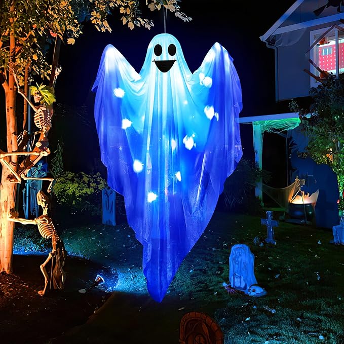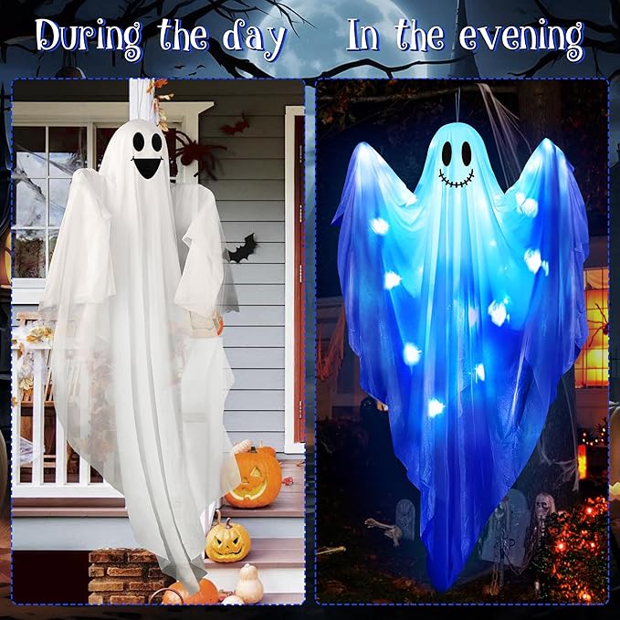 Hanging Ghost Decor - 47" Light Up Hanging Ghost with Blue LED Light, Halloween Ghost for Haunted House Prop Spooky Yard Lawn Porch Door Party Decor Supplies
