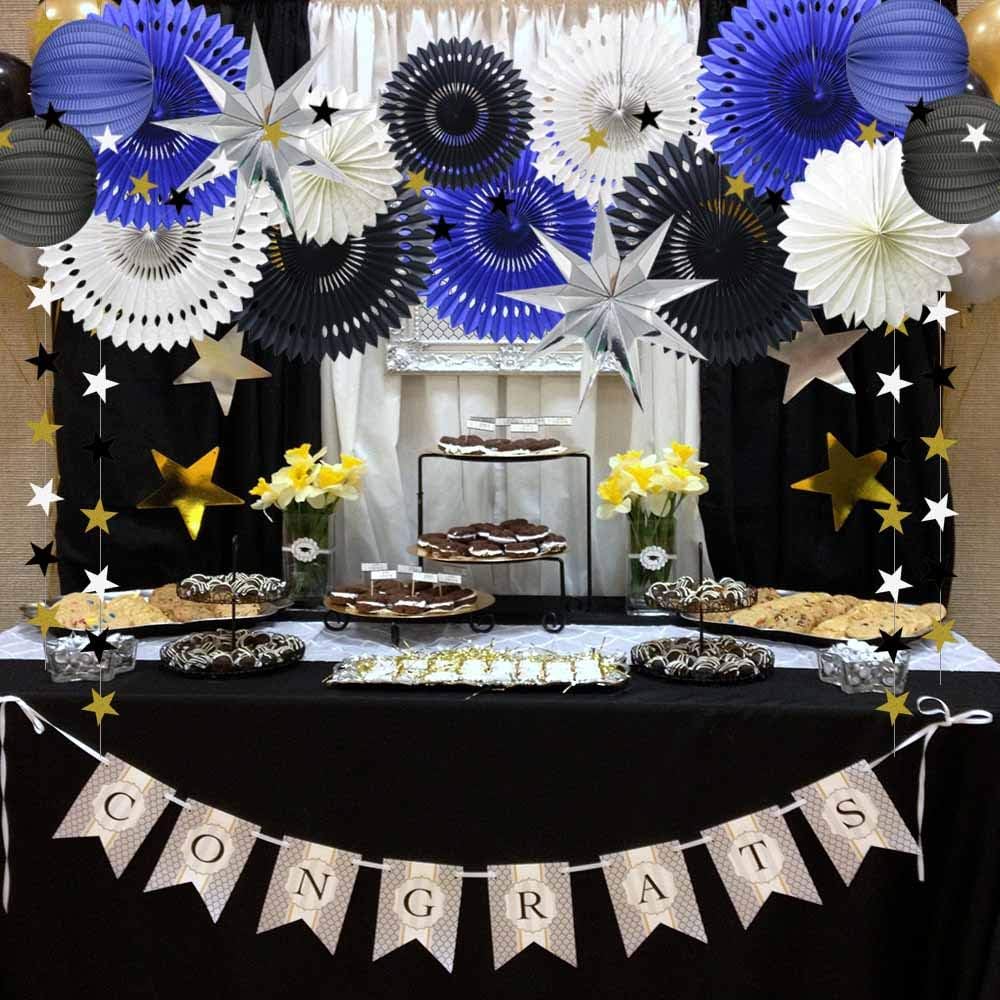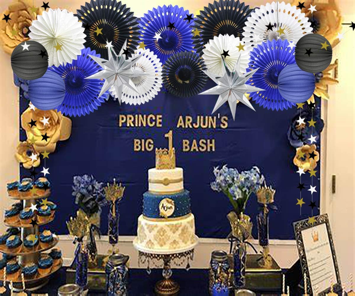 Hanging Party Decoration Supplies Set of Tissue Paper Fans Star Garland Paper Lanterns for Graduation Wedding Anniversary Birthday Backdrop Decoration (Navy Blue White Black)