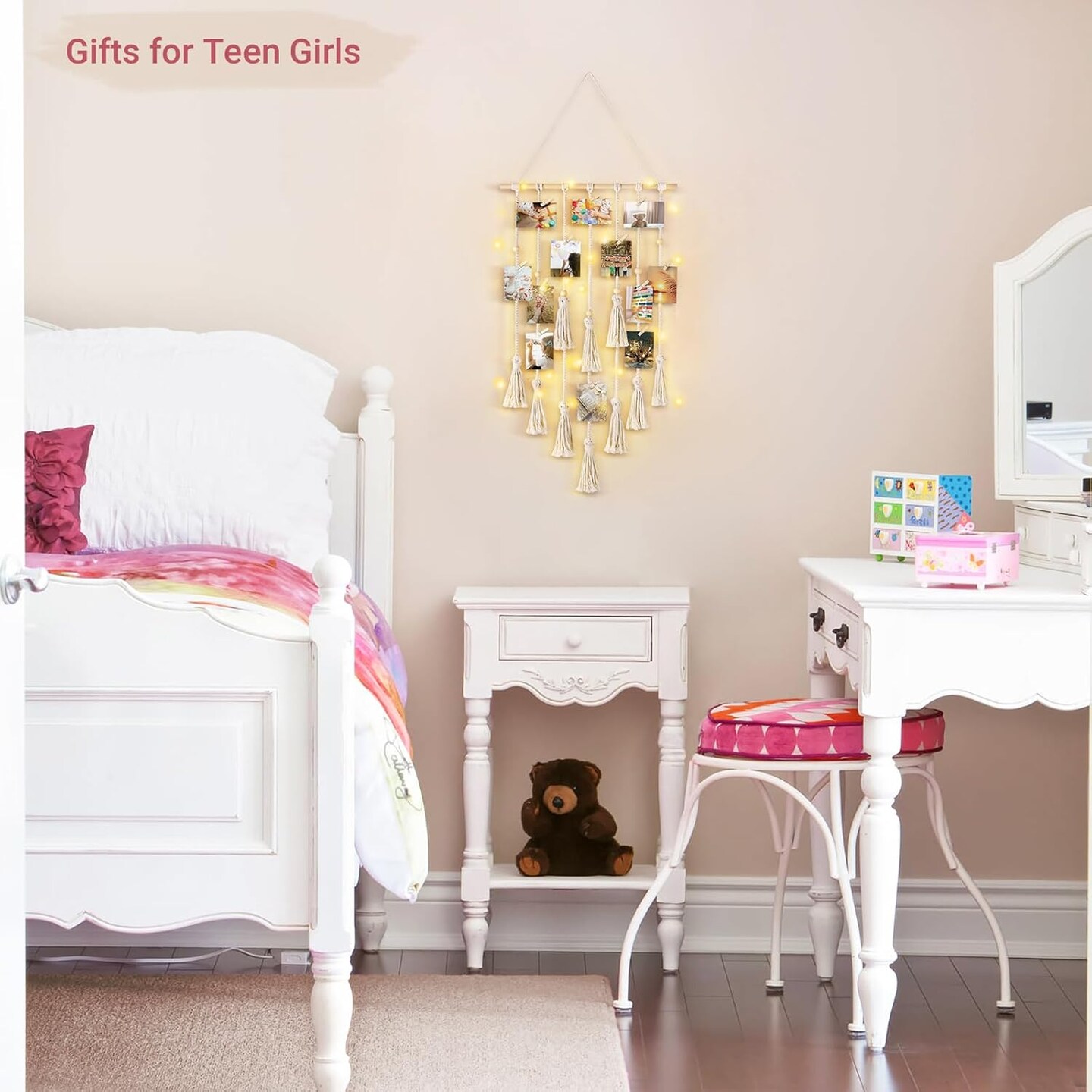 Hanging Photo Display Boho Macrame Wall Decor with Light|Ivory