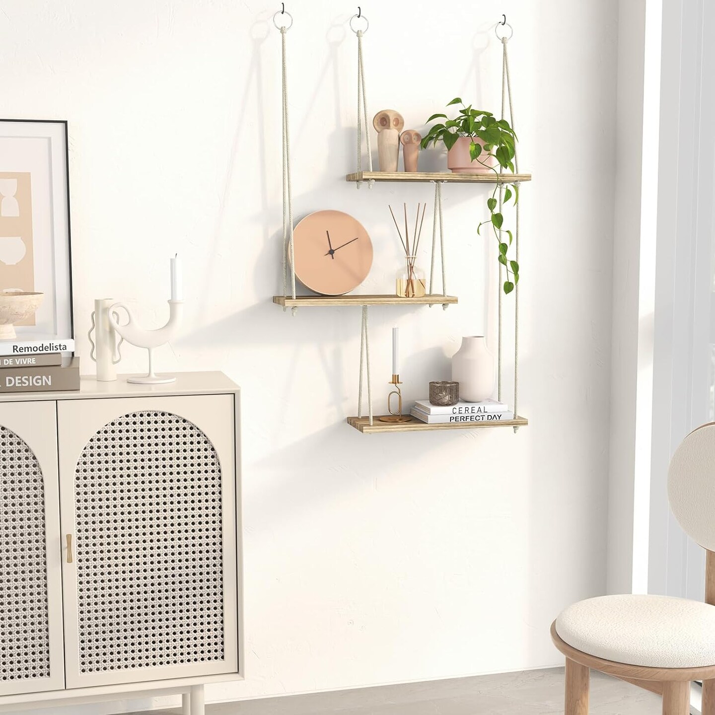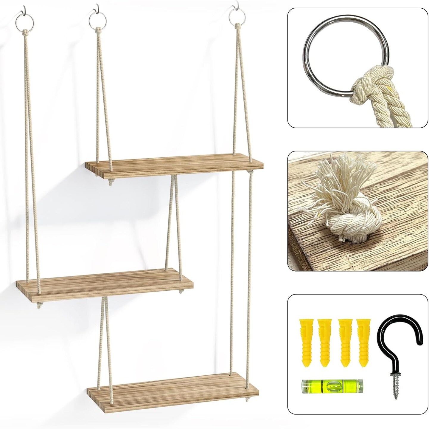 Hanging Shelves for Wall, 3 Tier Boho Wall Decor (Rustic Brown)