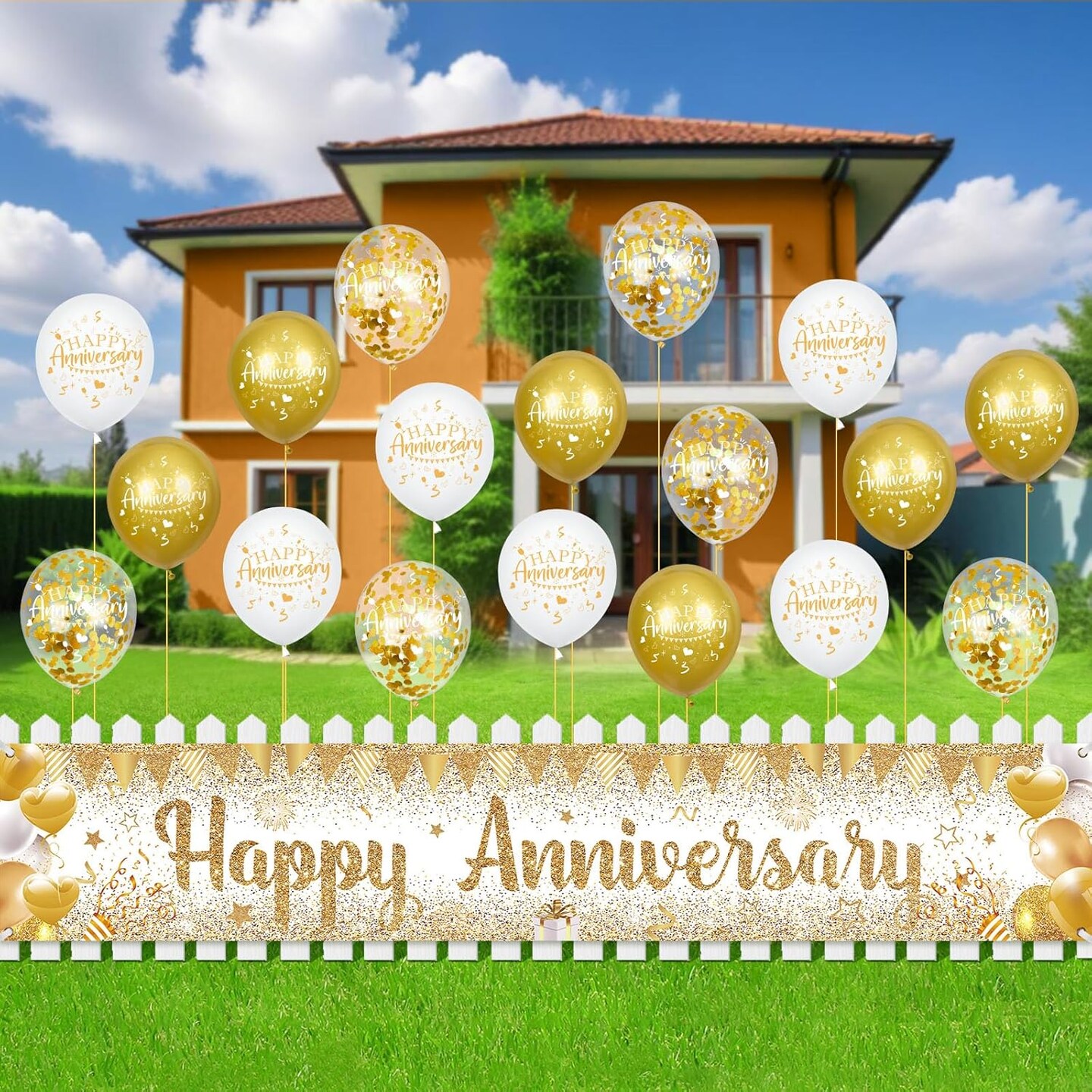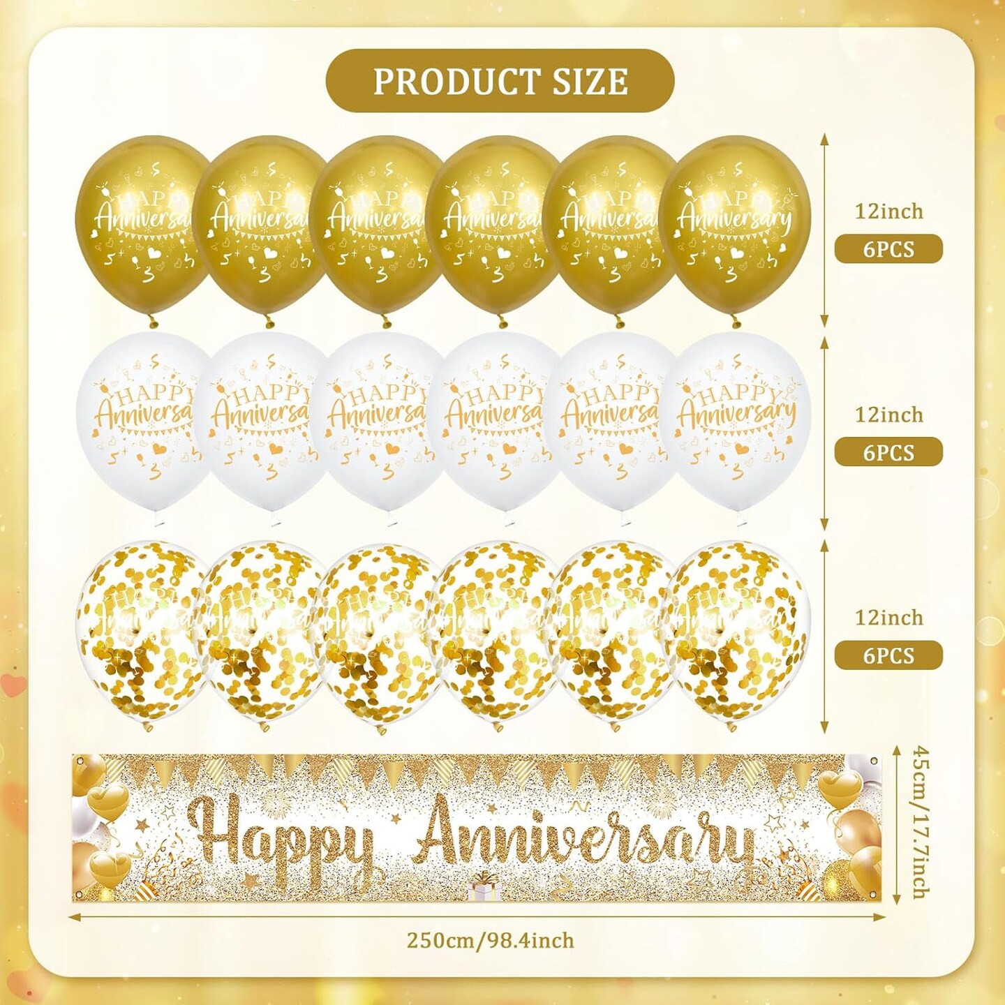Happy Anniversary Decorations - Banner, White Gold with 18pcs Balloons & Confetti Set (White Gold Happy Anniversary)