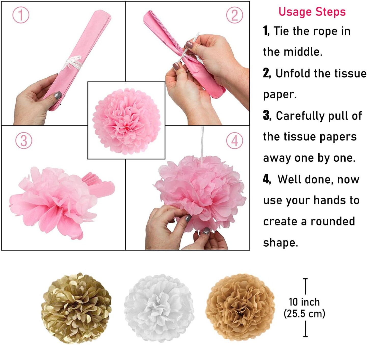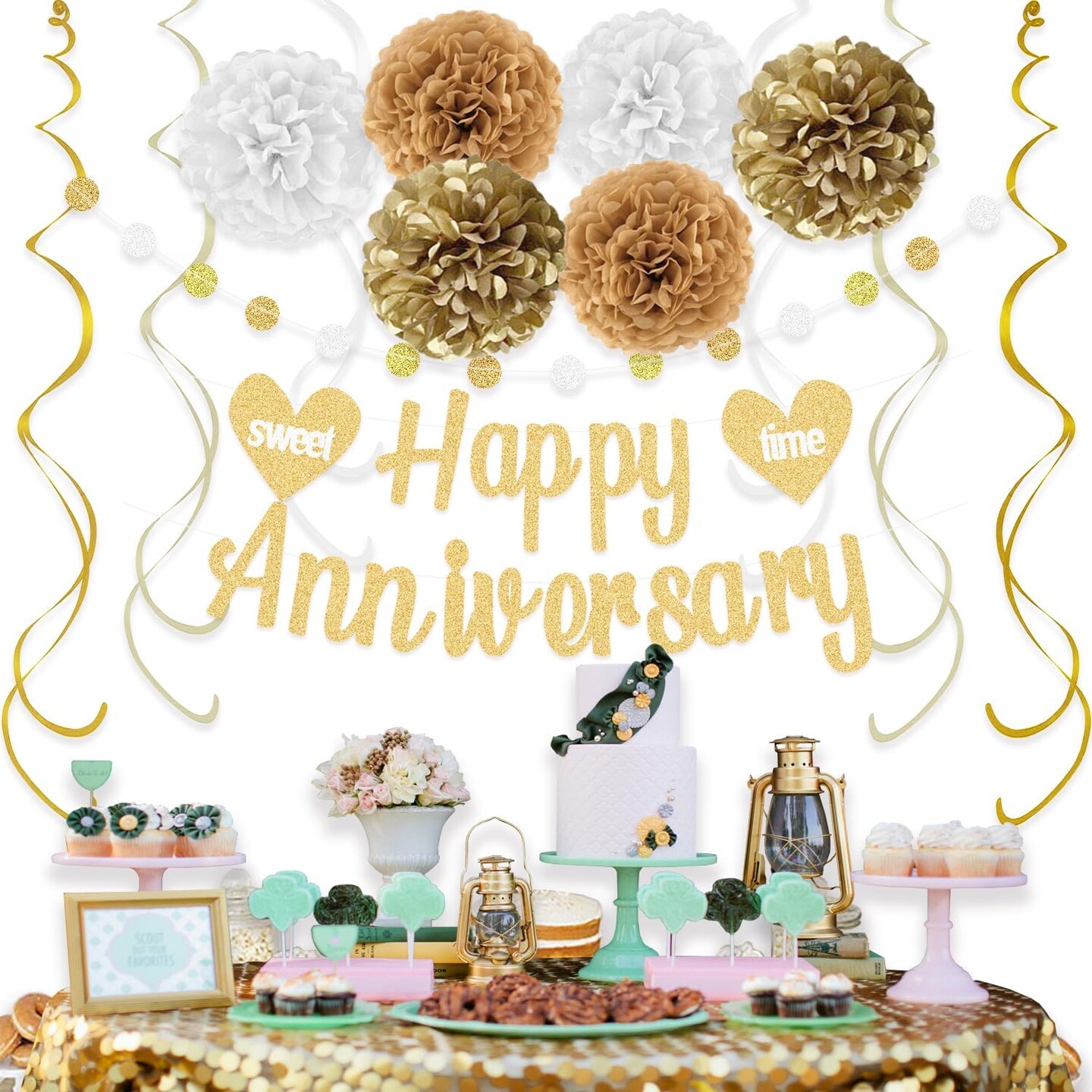 Happy Anniversary Decorations – Gold Banner, Pom Poms, Swirls & Garland (Gold White)