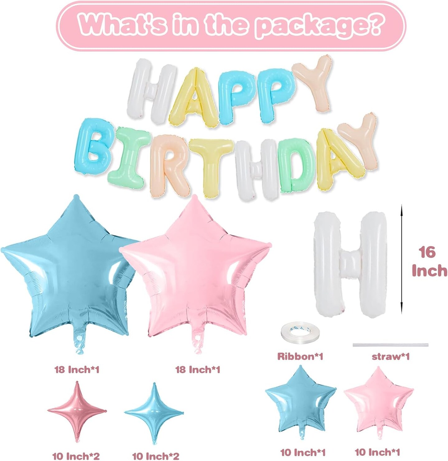 Happy Birthday Balloons, Colorful Happy Birthday Banner, Pastel Birthday Balloons 16 Inch Foil Letter Balloon with 8 Pcs Blue Pink Star Balloon for Boys Girls Birthday Party Decoration