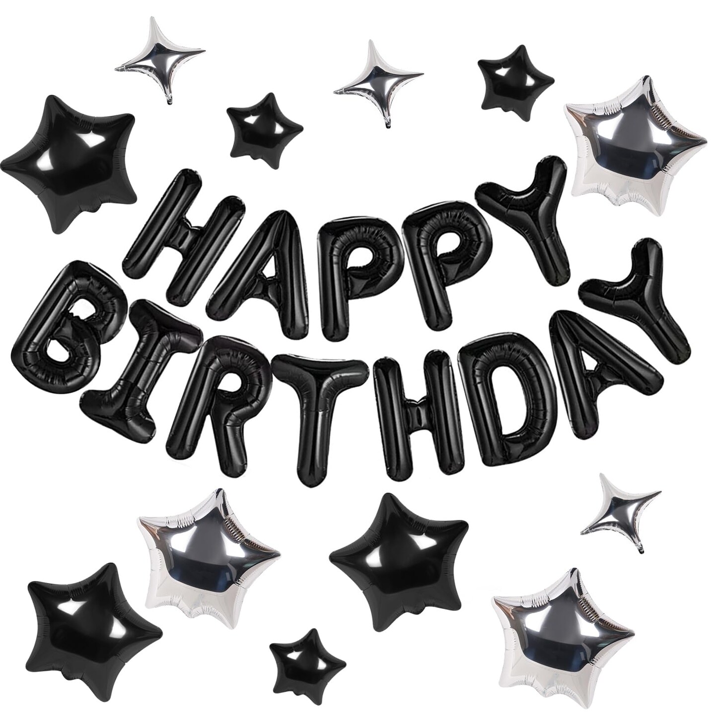 Happy Birthday Banner 13pcs 16 Inch Mylar Foil Letters with 12pcs Star Balloons Birthday Party Decorations for Kids and Adults - 3D Black