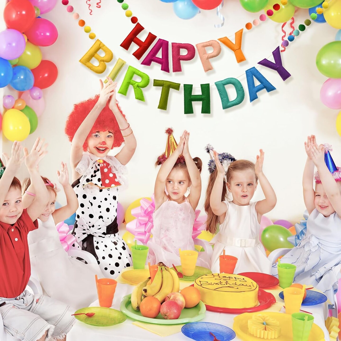 Happy Birthday Banner Felt Ball Garland Colorful Dainty Pre-Strung Rainbow Birthday Banner Reusable Happy Birthday Sign Photo Booth Props Primary Color Birthday Party Decoration for Kids Girls