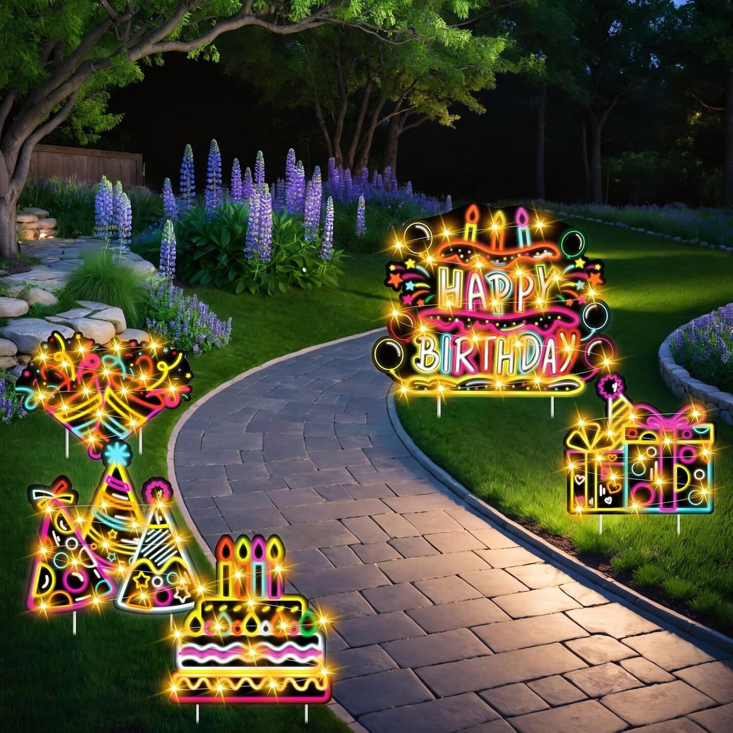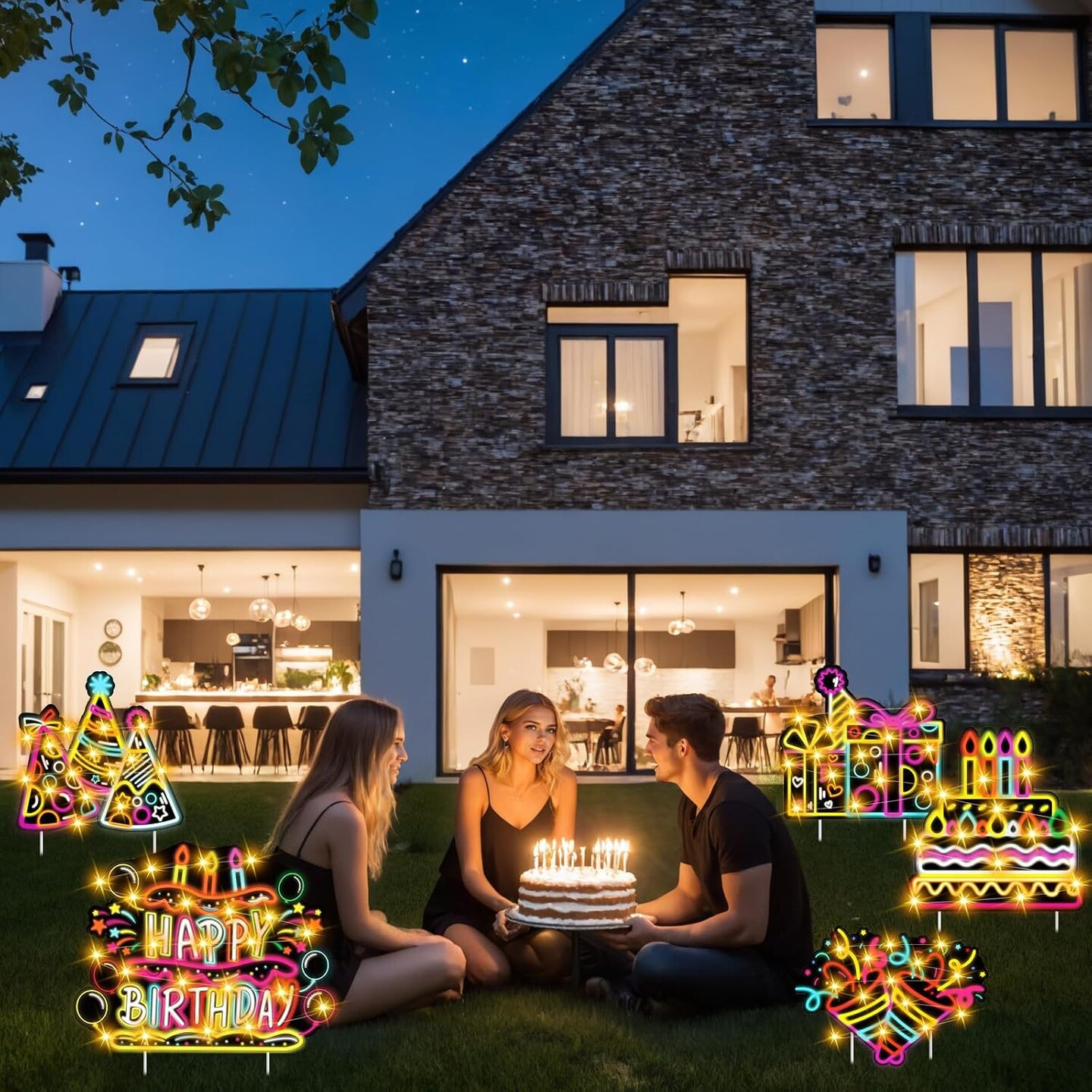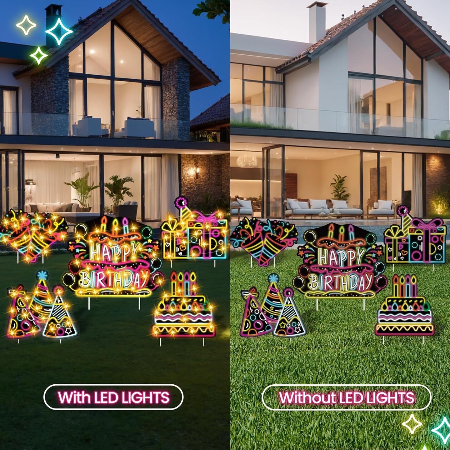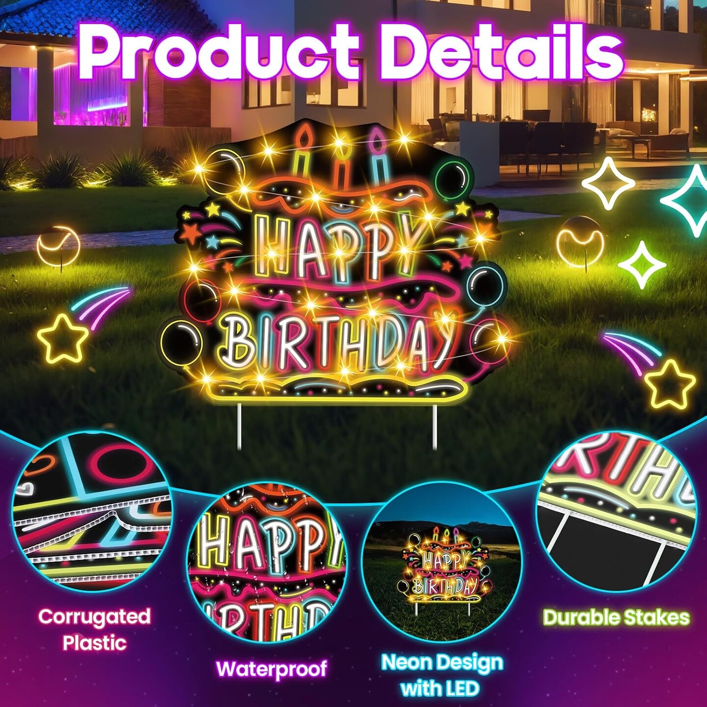 Happy Birthday Yard Signs with Stakes - LED Outdoor Lawn Signs Neon Waterproof Sign with Lights - Gift Box Lighted Yard Signs for Garden Outdoor Party Supplies