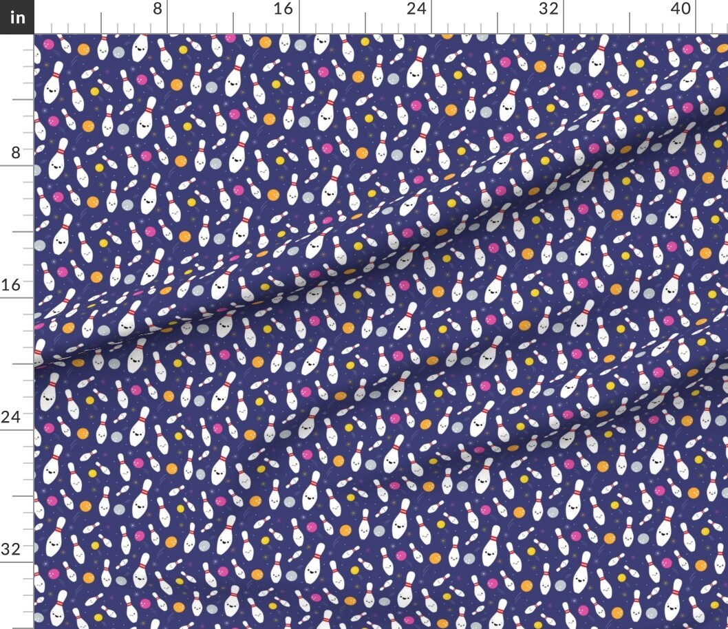 Happy Bowling Party Dark Blue Ball Strike Cute Kawaii Custom Printed Fabric by Spoonflower Various Fabrics by the Yard or Fat Quarter