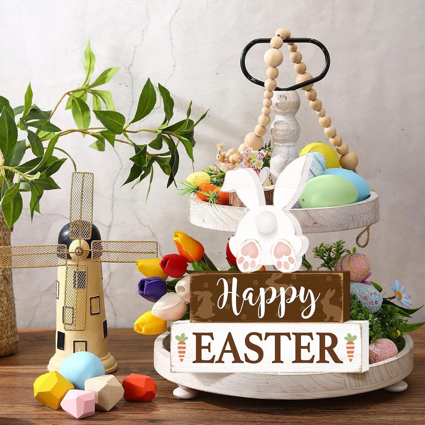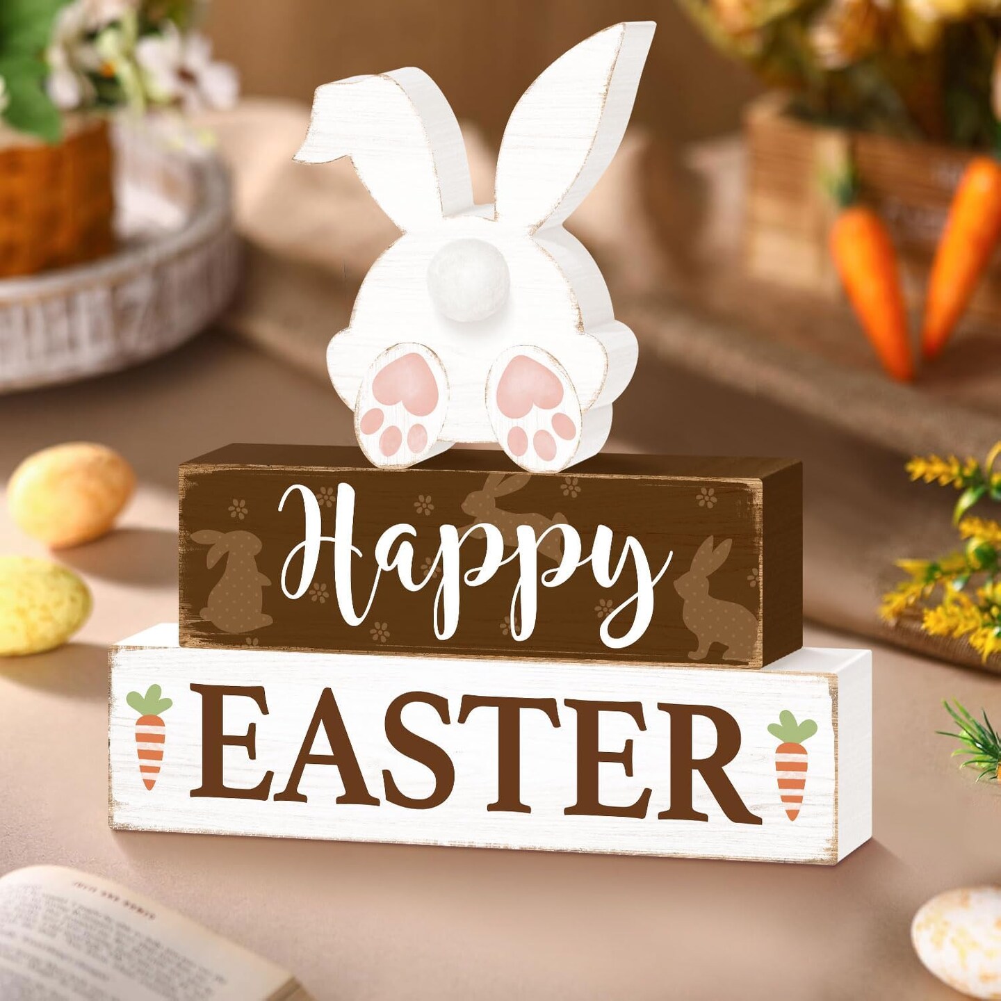 Happy Easter Bunny Table Sign Decorations, Easter Wooden Block Tabletop Centerpiece Signs, Rustic Farmhouse Spring Bunny Holiday Decorations for Tiered Tray Home Decor 3 Layered