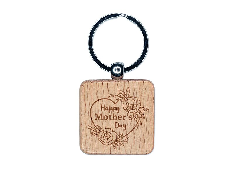 Happy Mother's Day Heart with Elegant Roses Engraved Wood Square Keychain Tag Charm