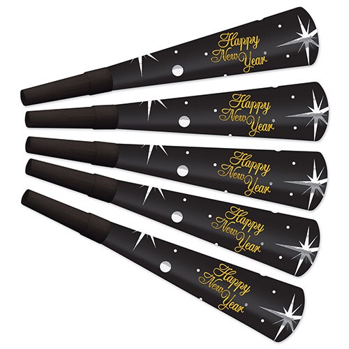 Happy New Year Shimmer Horns Noisemaker Party Favors And Supplies, 9", Black/Silver/Gold Pack of 100
