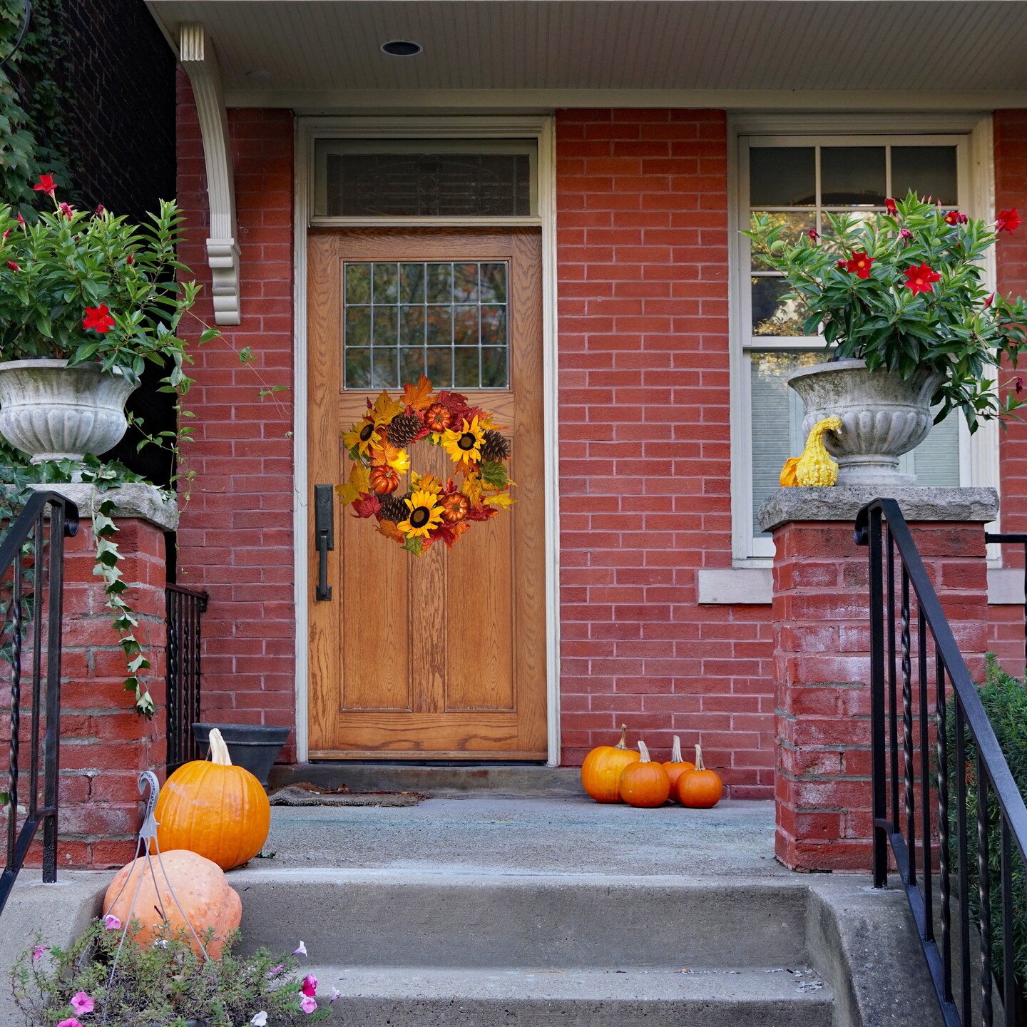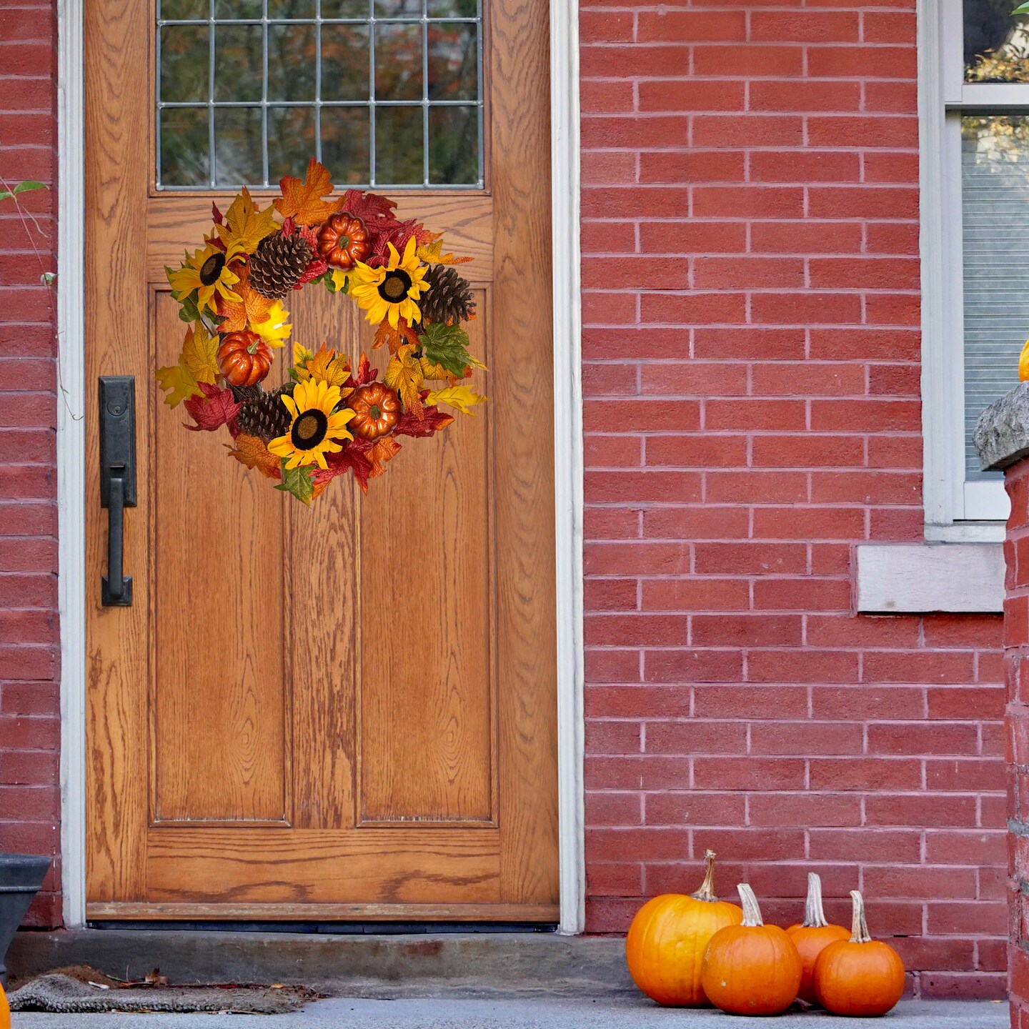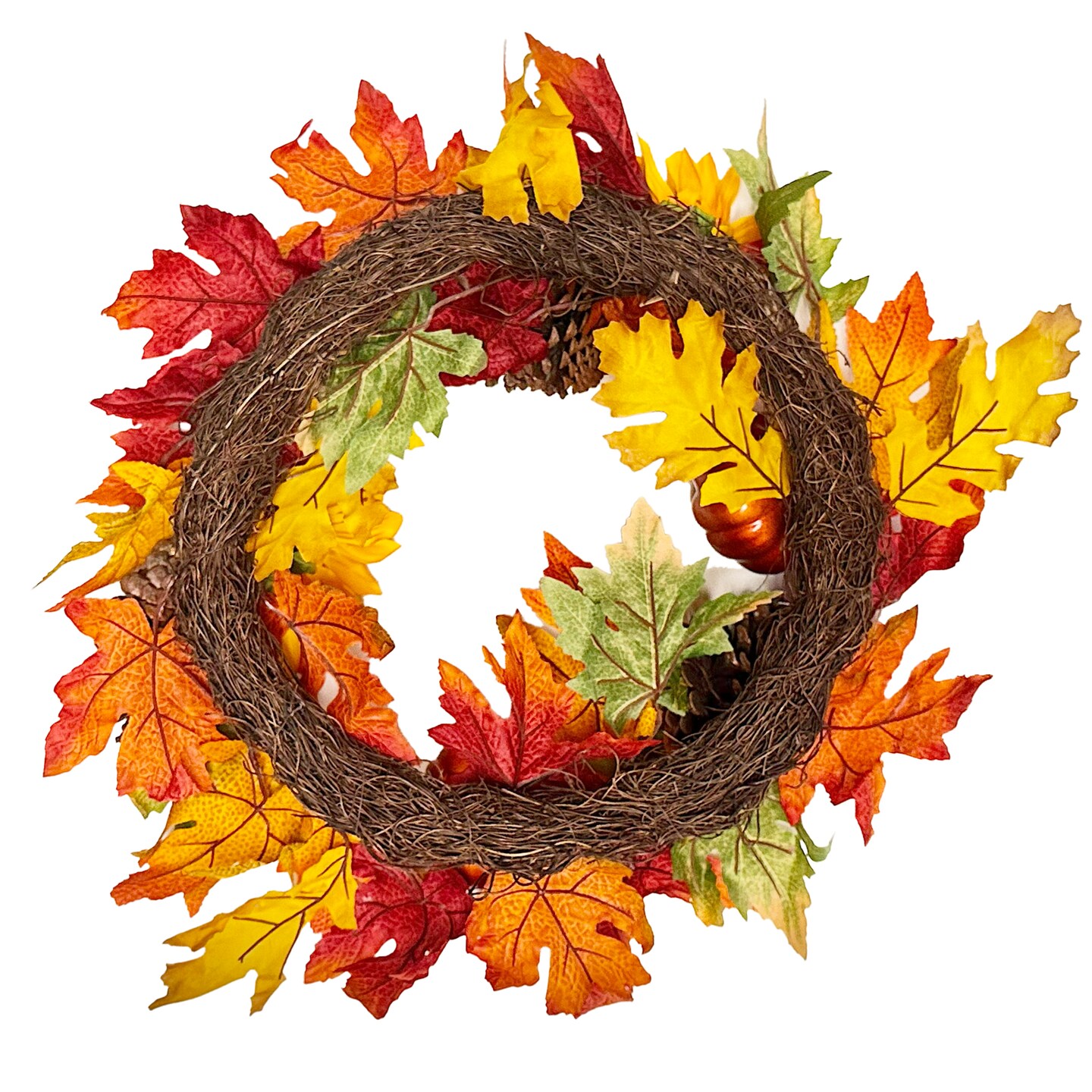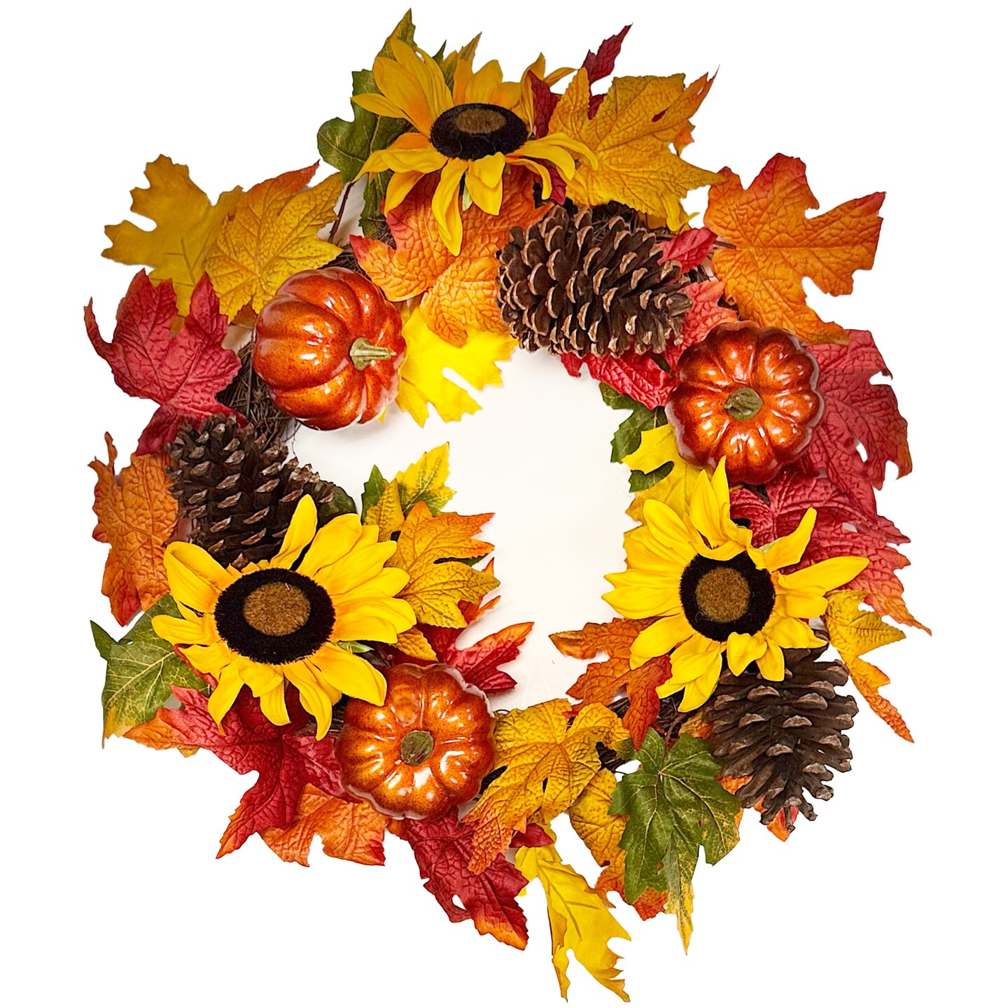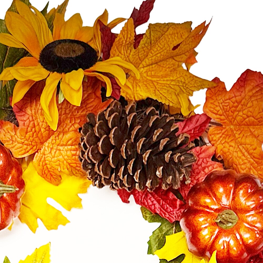 Haute Decor 24 Inch Fall Sunflower Artificial Wreath with Grapevine Base, Real Pinecones, Faux Berries and Pumpkins, Autumn, Fall, Halloween Door or Wall Decoration