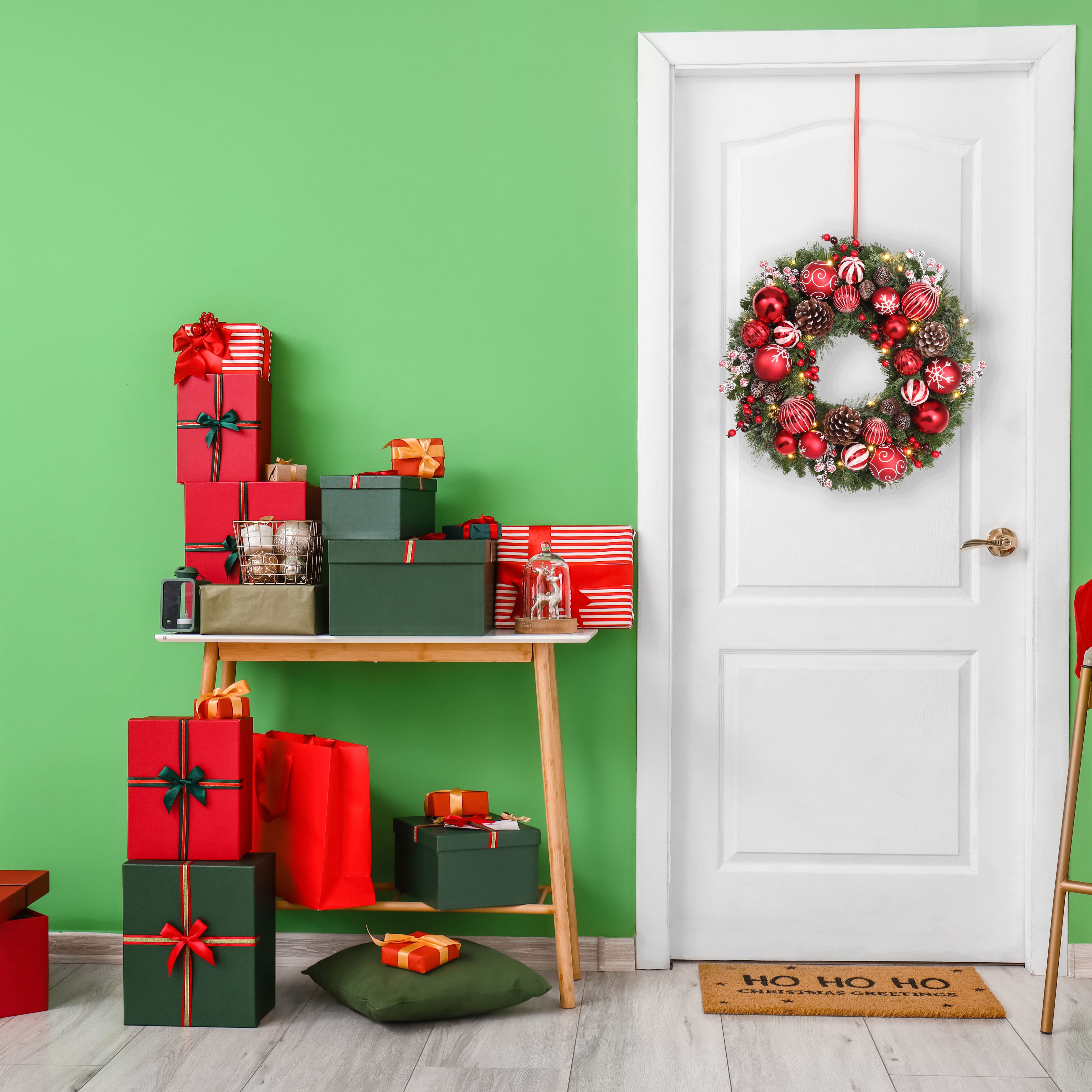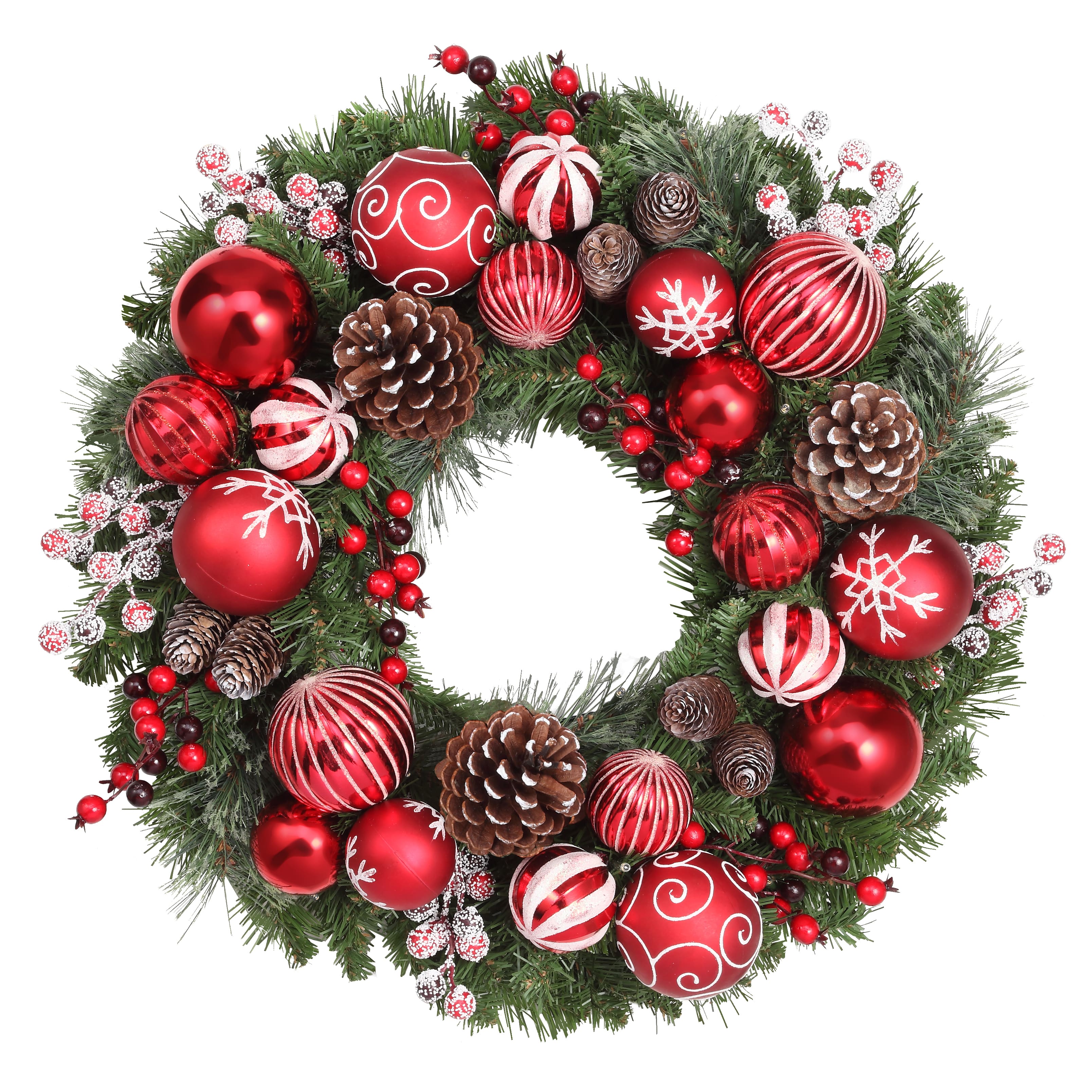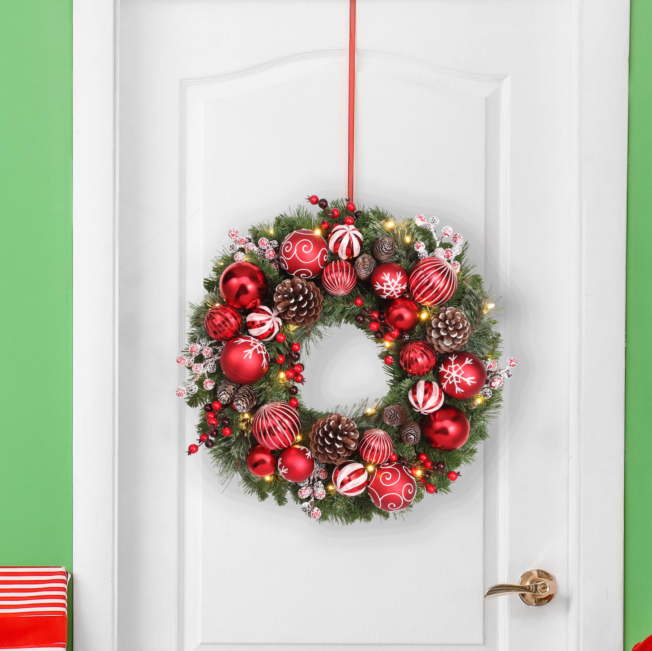 Haute Decor 26" Pre-Lit Holiday Times Red & White Ornament, Berry & Pinecone Wreath, Soft White LED Lights