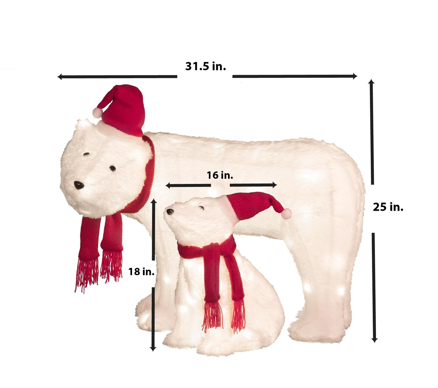 Haute Decor Mama and Baby Polar Bear (Set of 2) Easy Setup Outdoor Lighted Christmas Yard Decor with 50 Warm White LED Lights and Classic Red and White Hat and Scarf