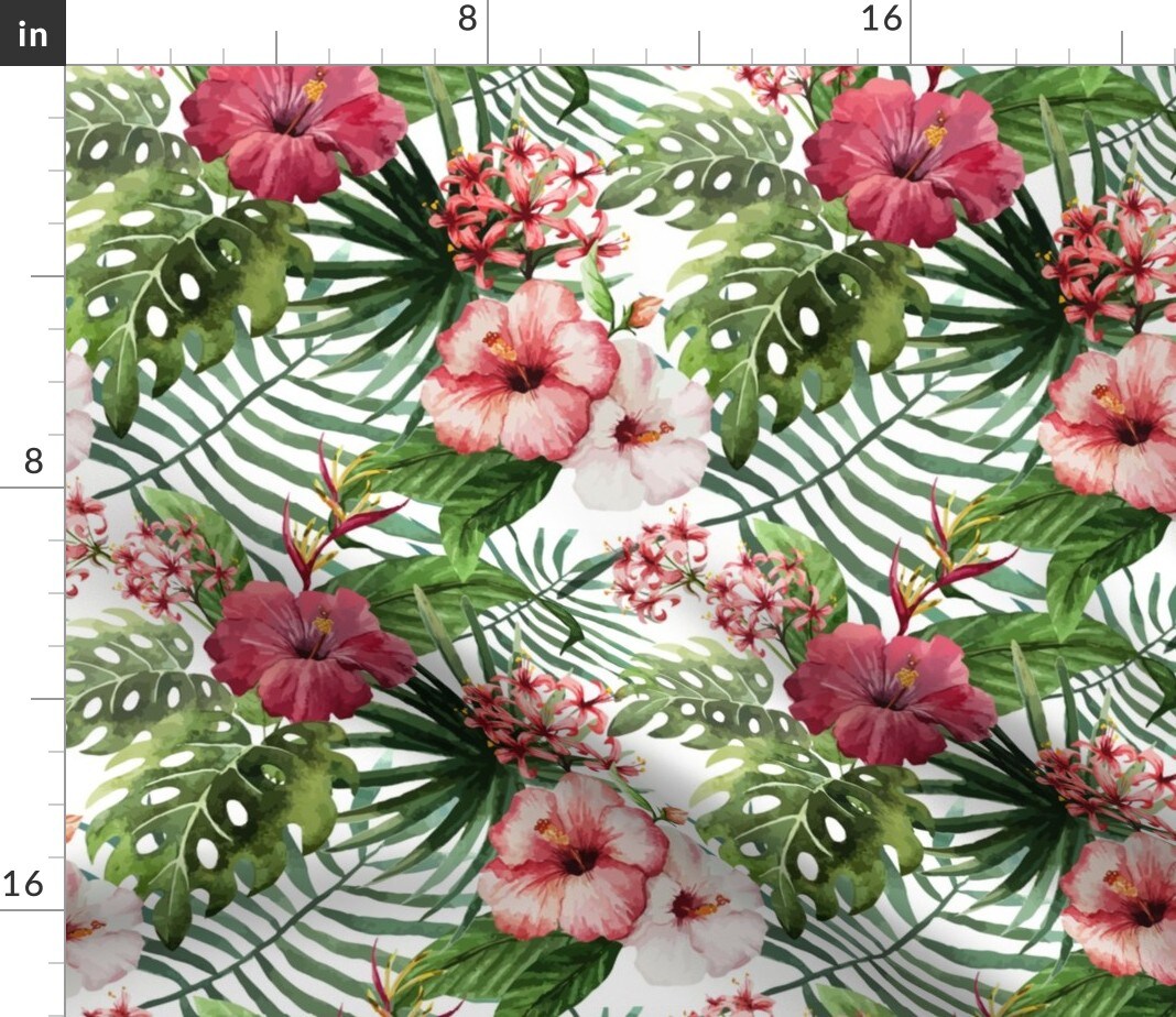 Hawaii Watercolor Hibiscus Flowers Floral Tropical Summer Palm Leaf Custom Printed Fabric by Spoonflower Various Fabrics by the Yard or Fat Quarter