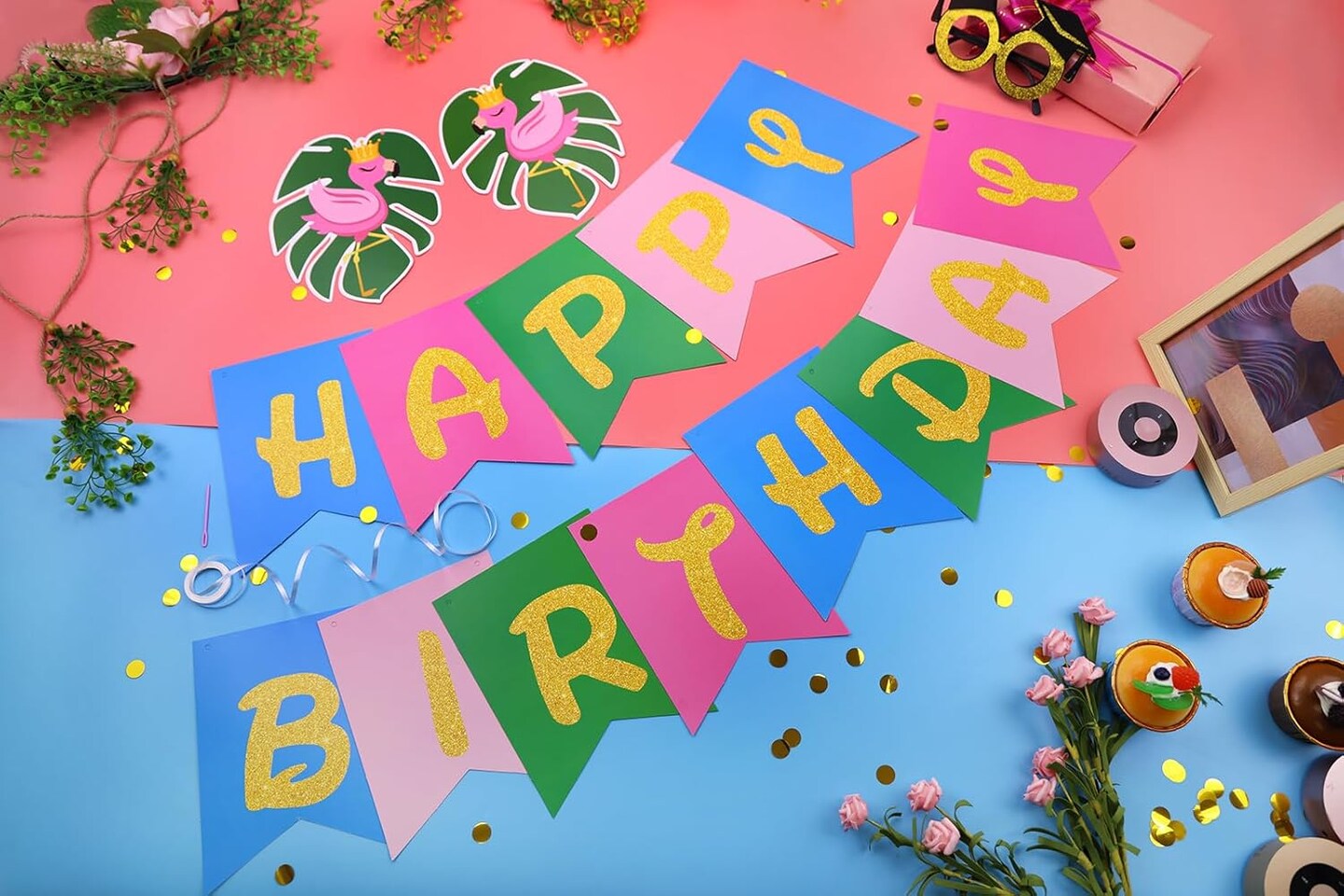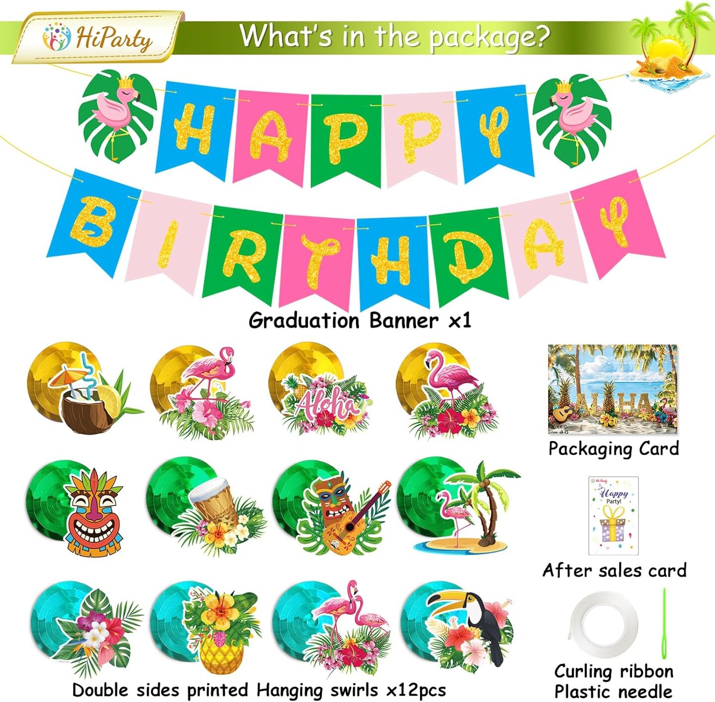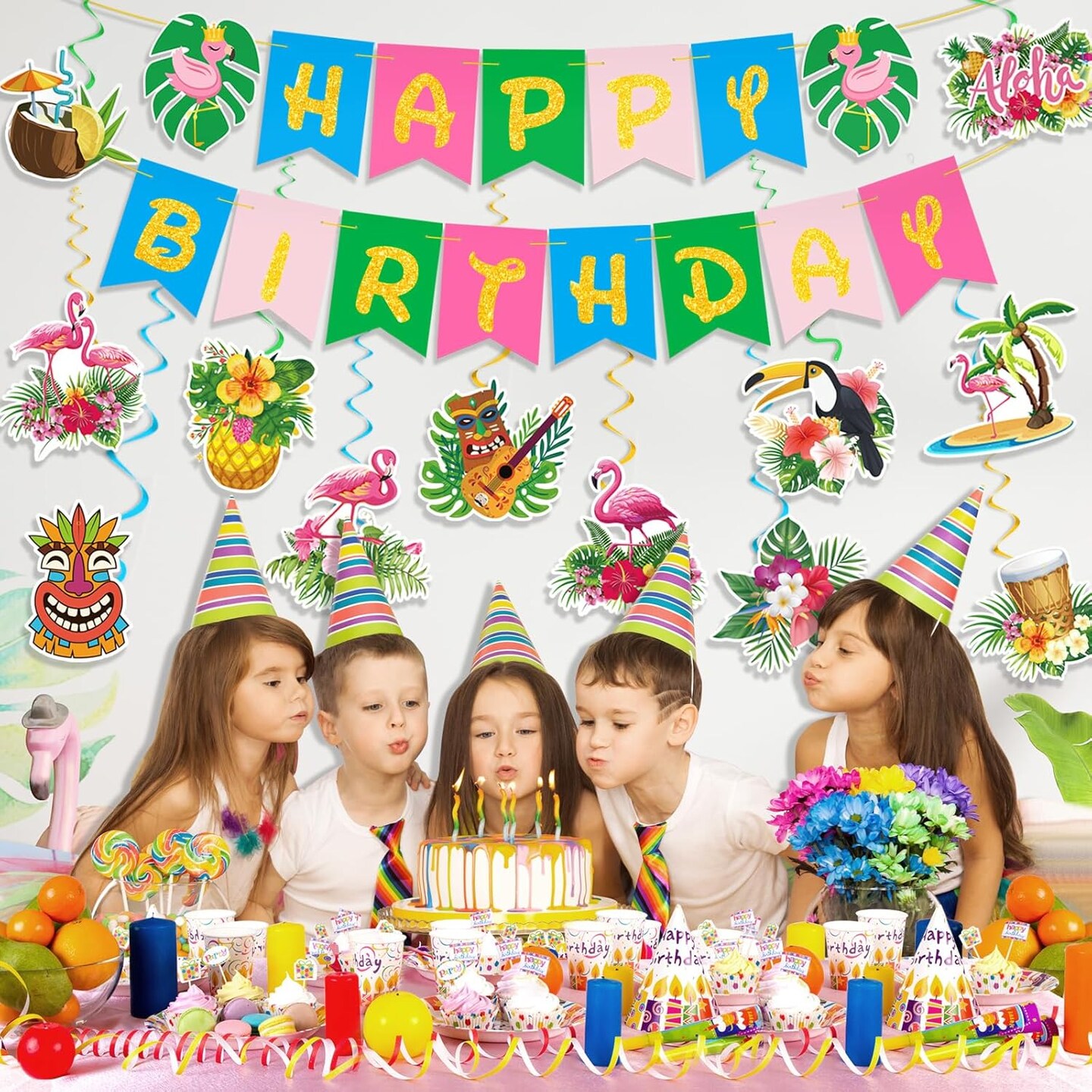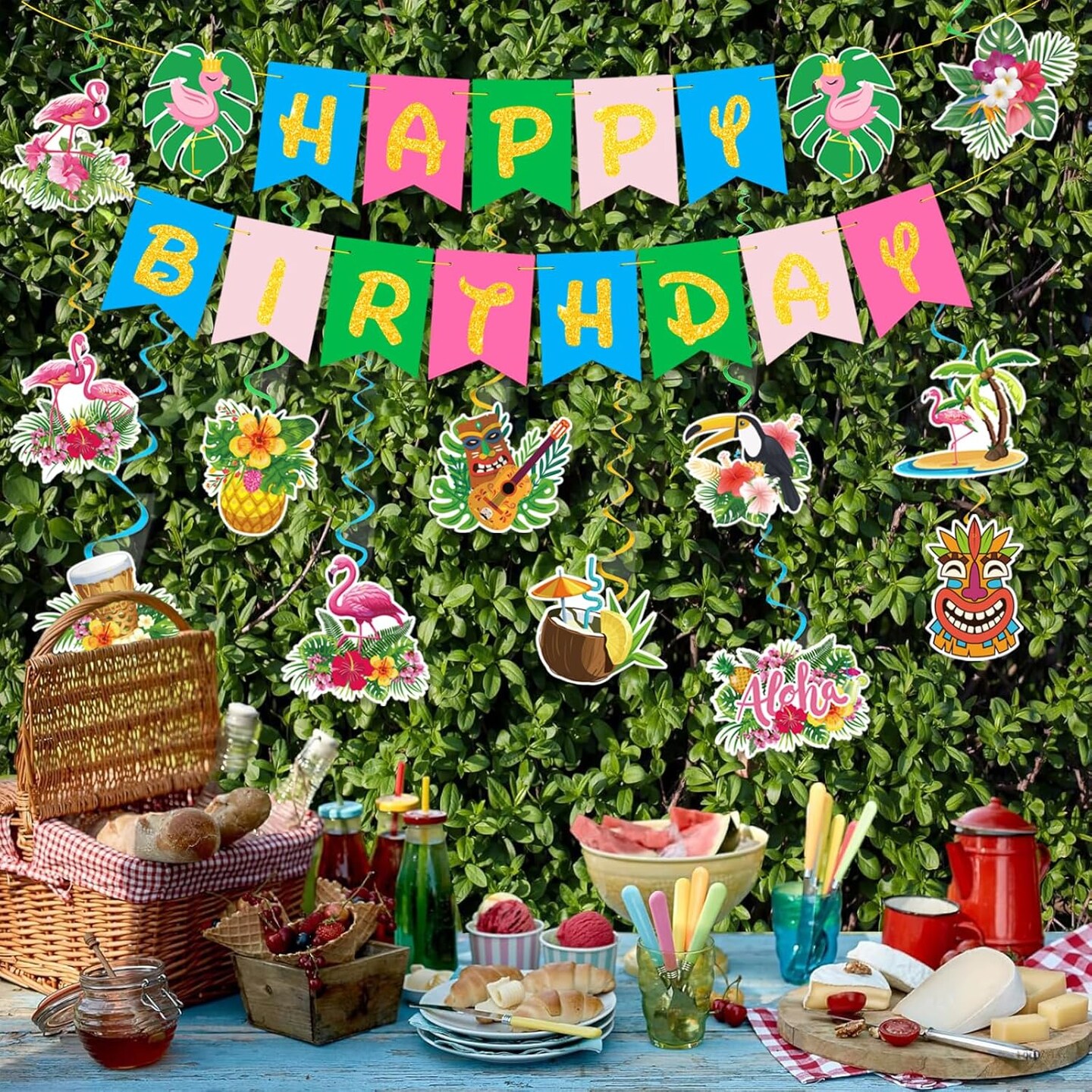 Hawaiian Aloha Party Banner Decorations, Aloha Flamingo Birthday Banner Garland with 12pcs Luau Pineapple Hanging Swirls Banners, Tropical Tiki Summer Beach Pool Birthday Party Decorations