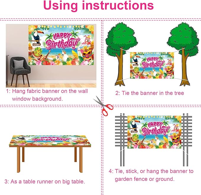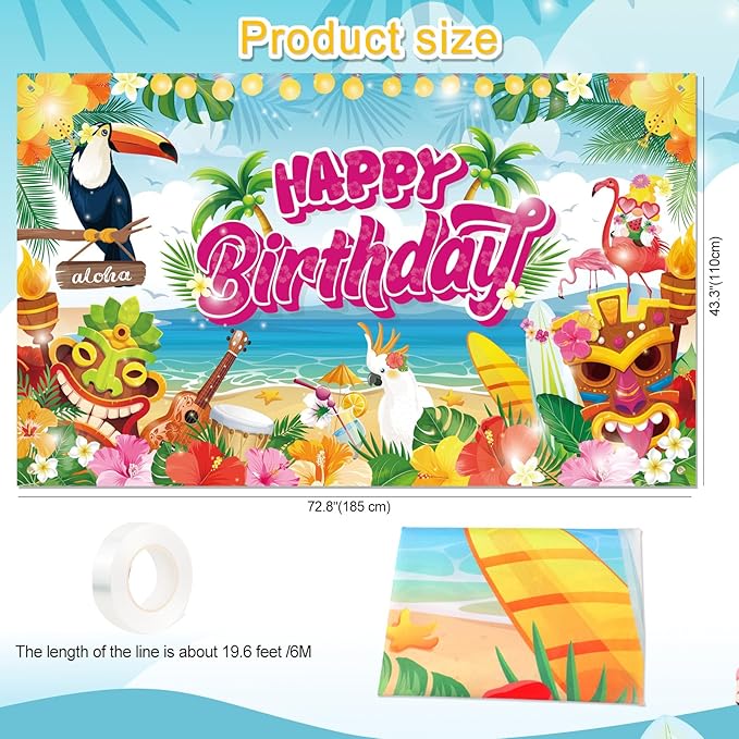 Hawaiian Birthday Backdrop Banner Decorations Aloha Luau Party, Large 72" x 43" Summer Happy Birthday Party Supplies for Hawaiian Tiki Beach Pool Party Flamingo Jungle Photography