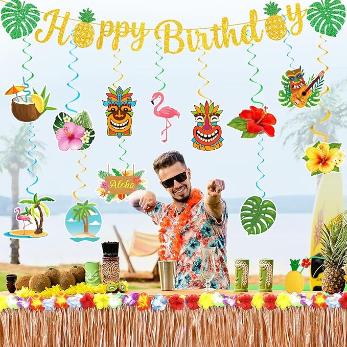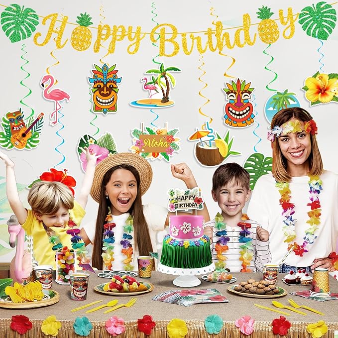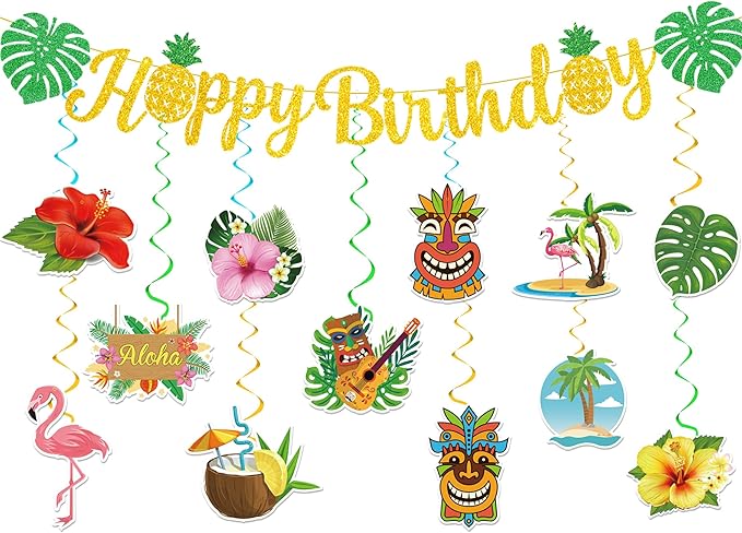Hawaiian Happy Birthday Banner,Luau Birthday Party Decorations Aloha Summer Beach Themed Glittery Flower Garland Tiki Flamingo Pineapple Palm Leaves Tropical Party Decorations for Birthday Decor