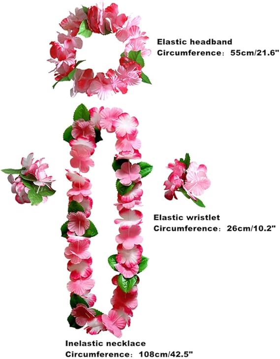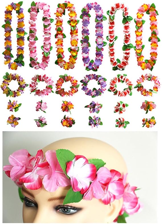 Hawaiian Hula Leis sets Artificial Flowers Fabric Wreath Neck Loop Wristband Headband Dance Garland Leis Sets for Luau Party Costumes (6 sets;24 Pack)