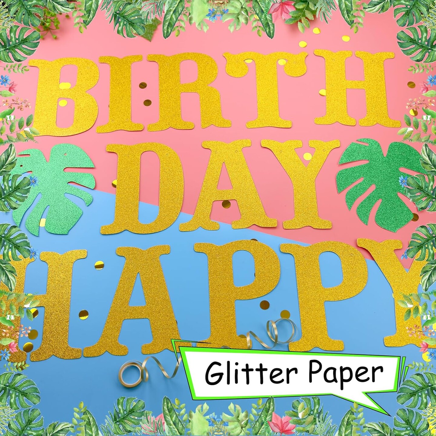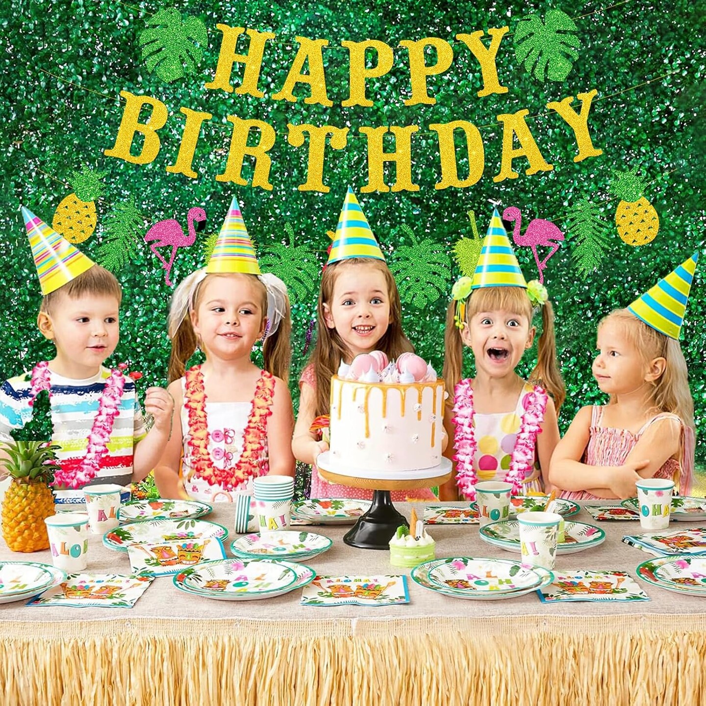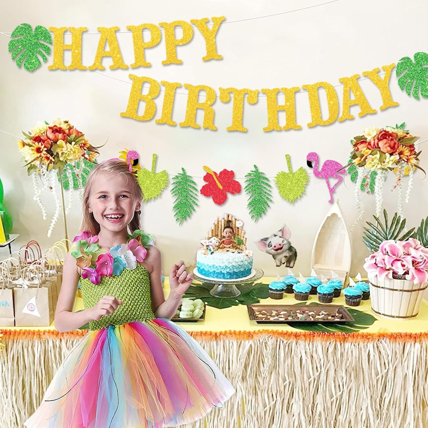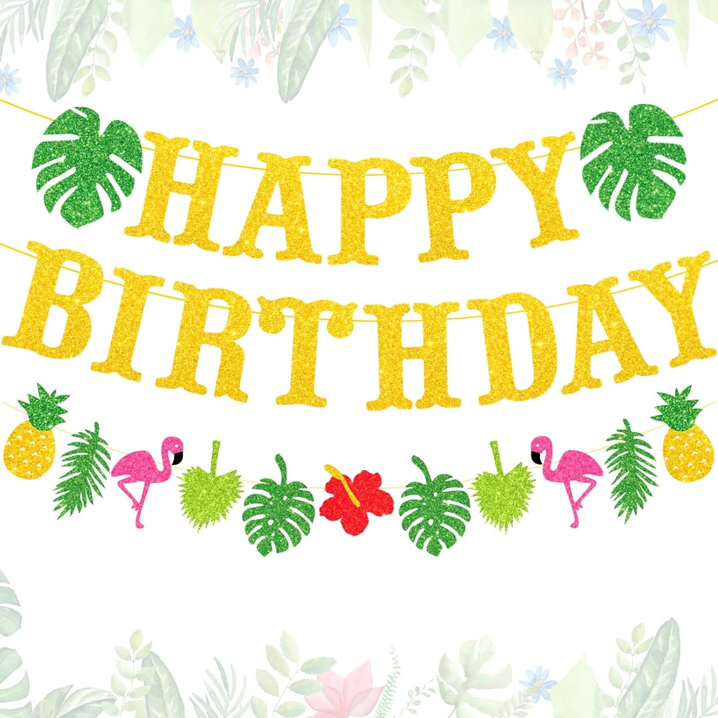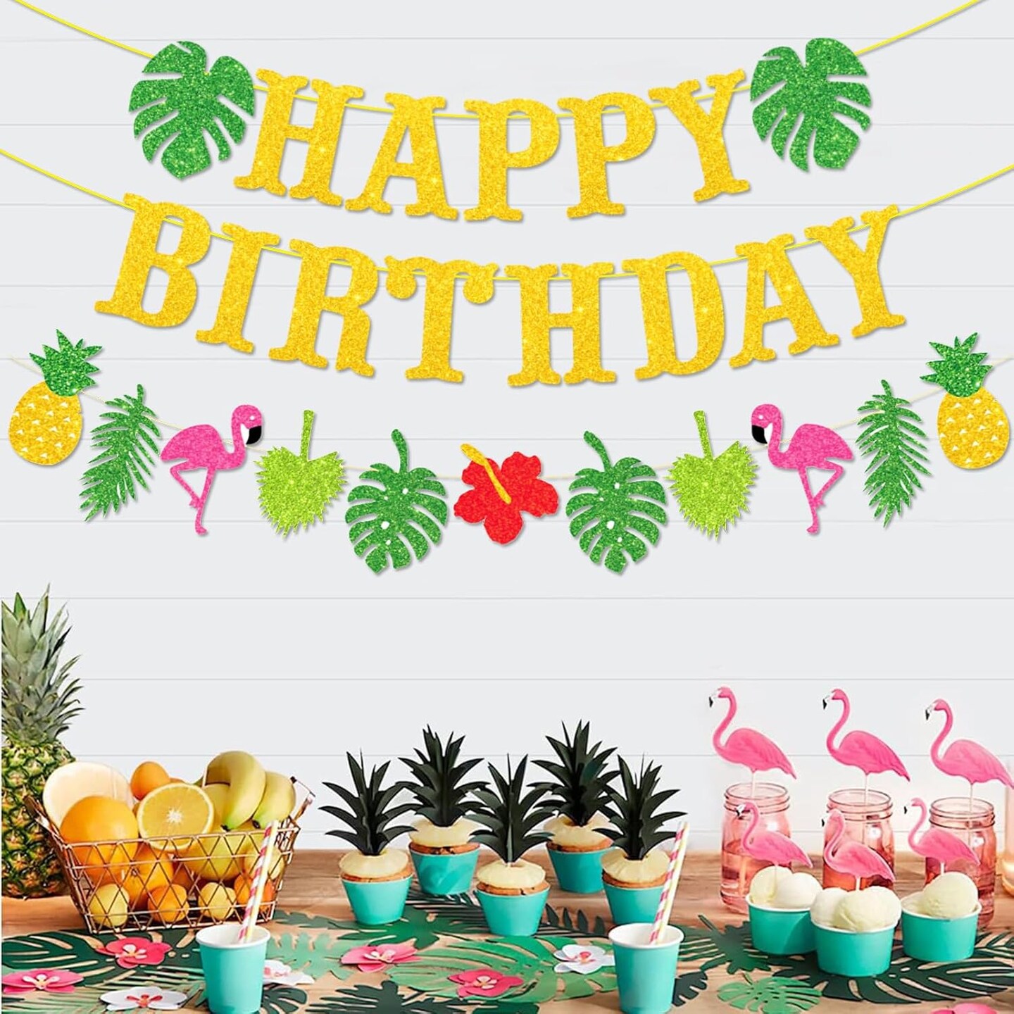 Hawaiian Luau Birthday Party Decorations, 26pcs Gold Glitter Tropical Happy Birthday Banner Sign with Flamingo Palm Tree Pineapple Tropical Garland for Summer Beach Hawaiian Theme Party Decorations