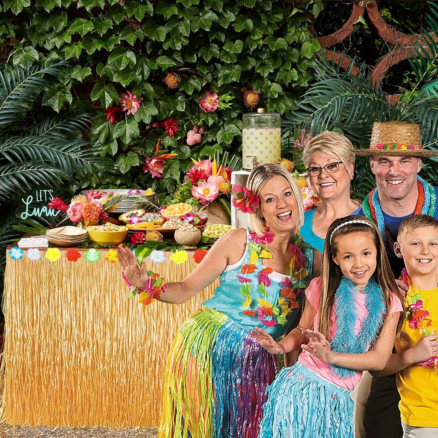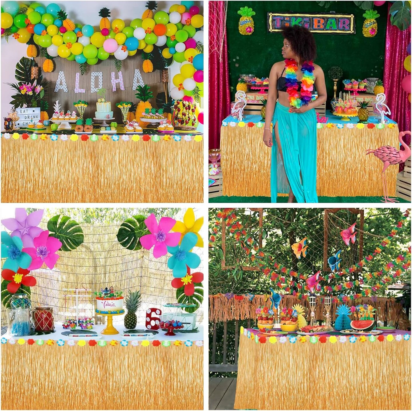 Hawaiian Party Decorations - Fake Grass Fringe w/Hibiscus Flowers