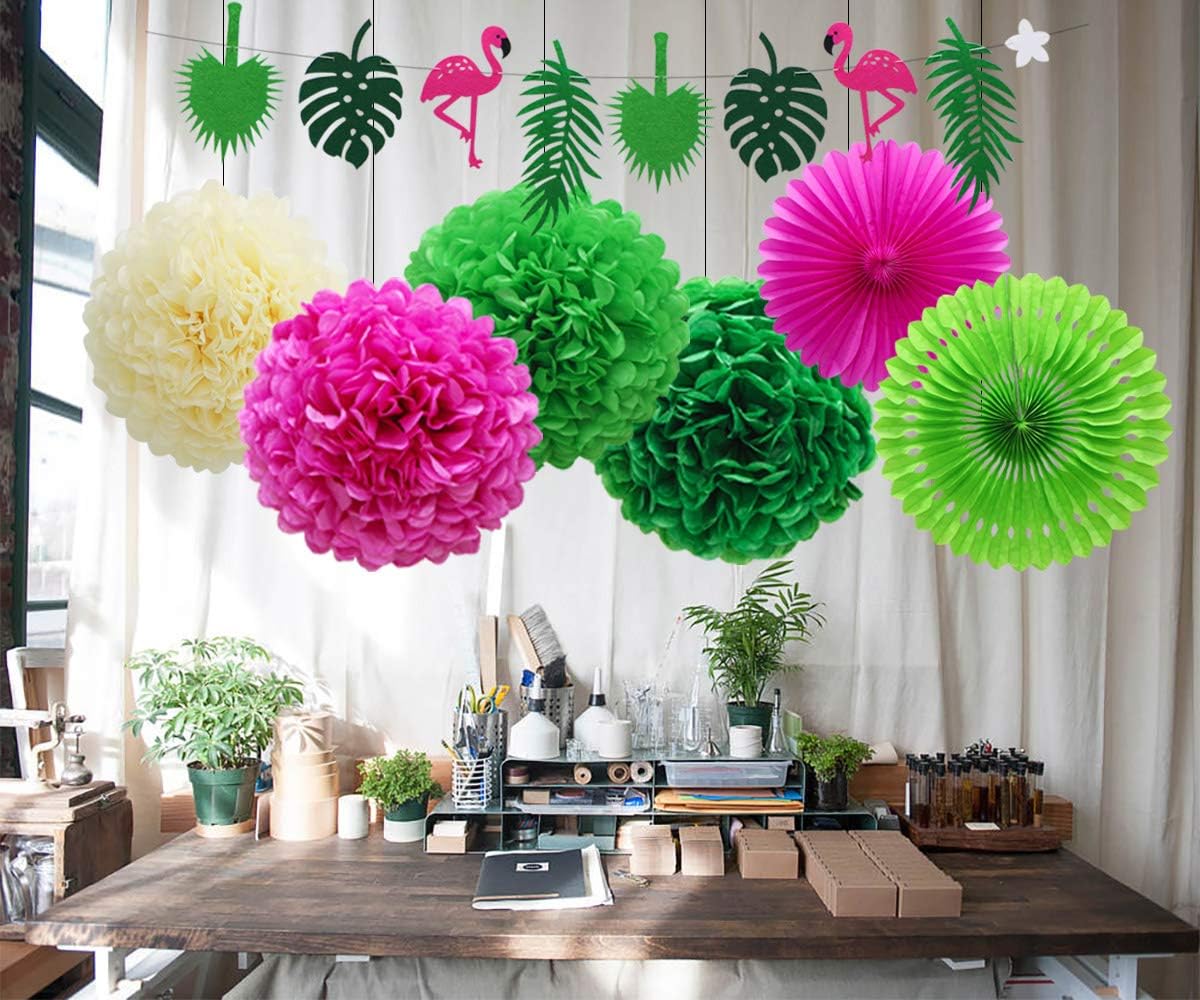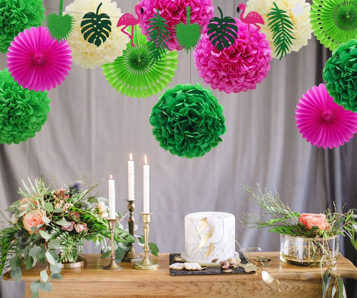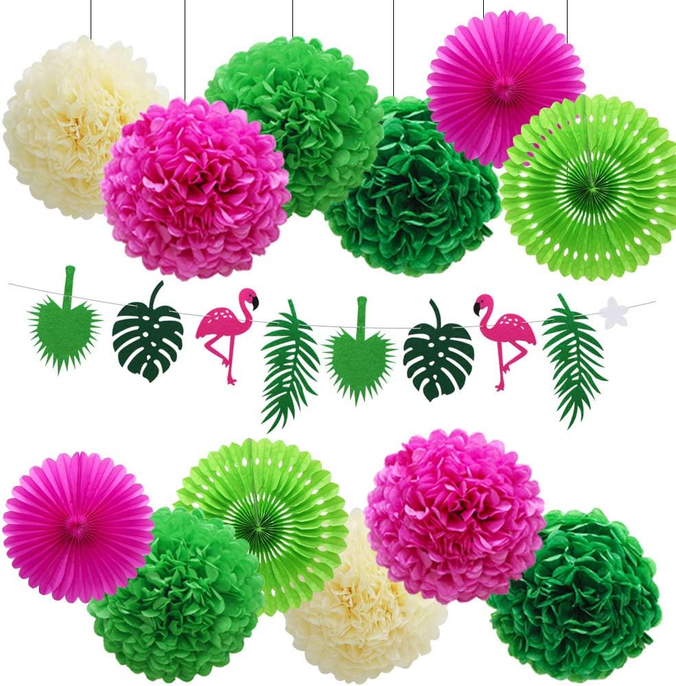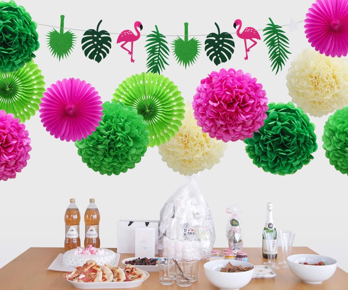 Hawaiian Party Decorations Flamingo Green Palm Leaf Banner with Pom Poms Paper Flowers Tissue Paper Fans for Luau Tropical Jungle Beach Safari Party Supplies Theme