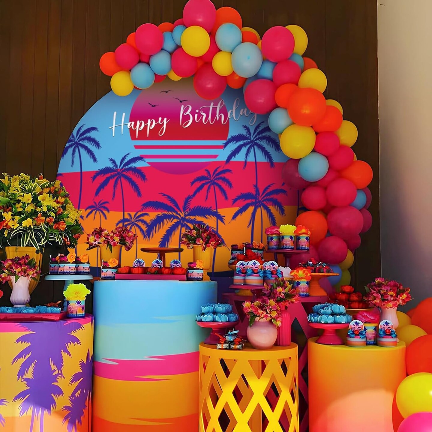 Hawaiian Tropical Party Decorations Summer Birthday Decor Supplies with Beach Island Palm Backdrop, Balloons Garland Arch Kit, Luau Tiki Tropical Happy Birthday Party Decorations (Dark)