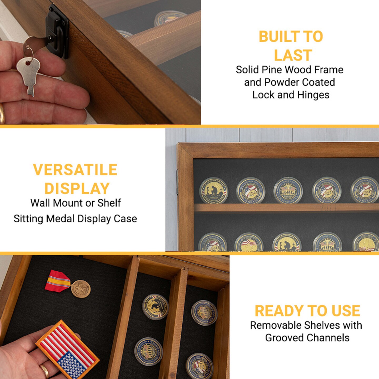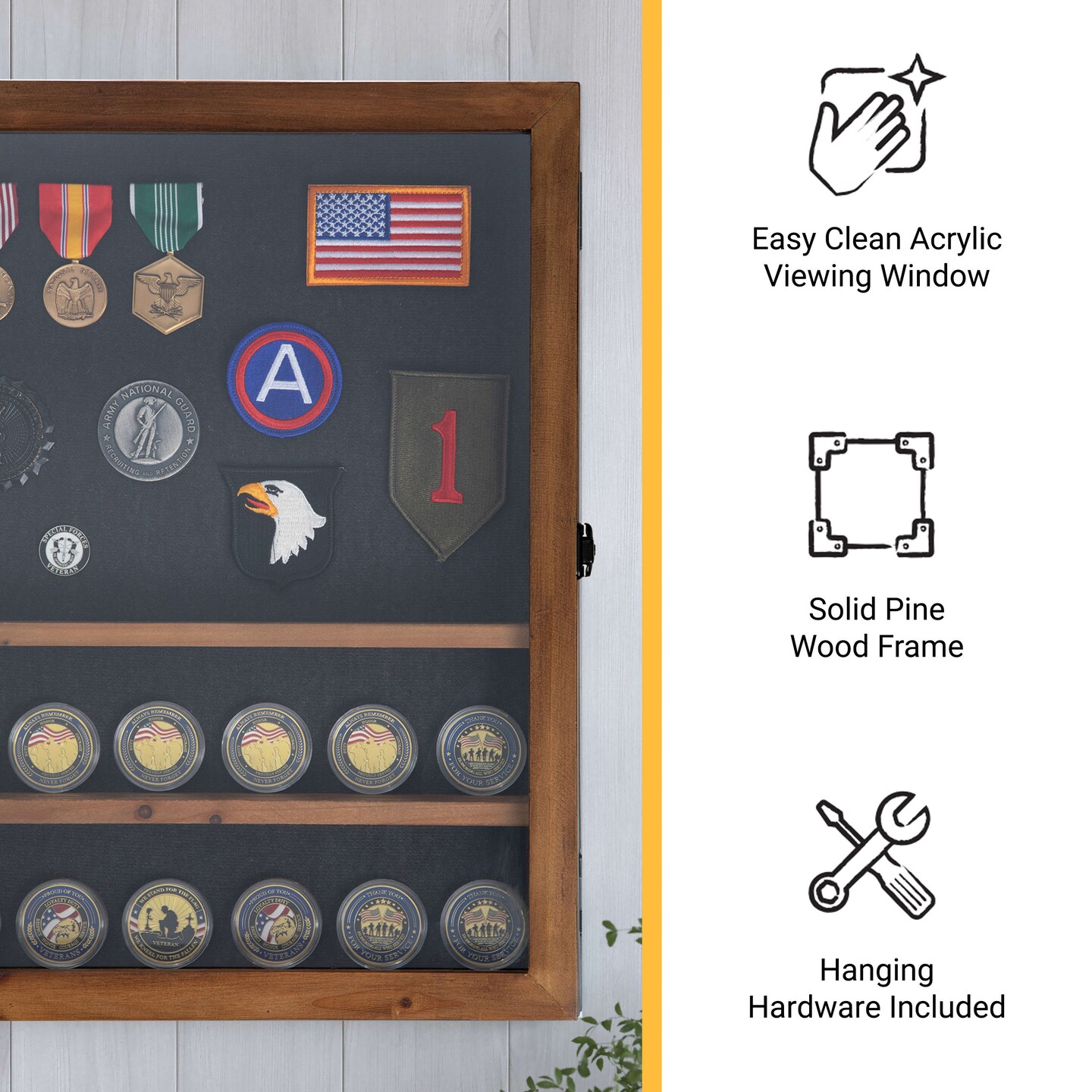 HBCY Creations Medals Display Case - Solid Wood with Acrylic Window - Anti-Theft Lock with 2 Keys - For Mementos and Keepsakes