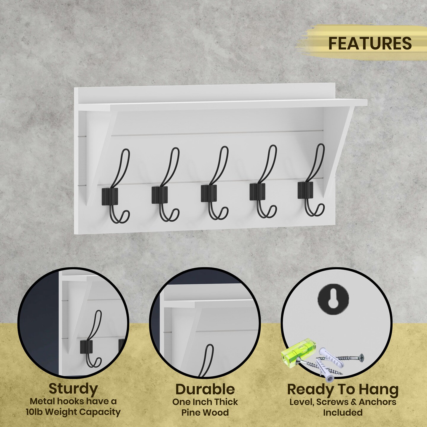 HBCY Creations Rustic Wall Mounted Coat Rack Shelf - Wooden Country Style 24" Entryway Shelf with Hooks - Solid Pine Wood - For Entryway, Kitchen, Bathroom