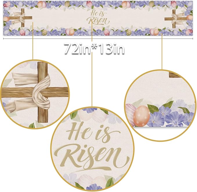 He is Risen Table Runner Easter Egg Spring Jesus Ressurrection Cross Home Kitchen Dining Room Decoration (13" x 72")