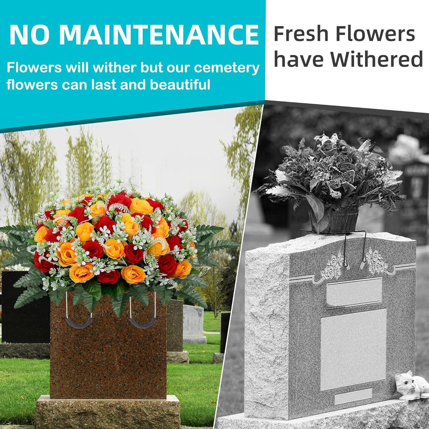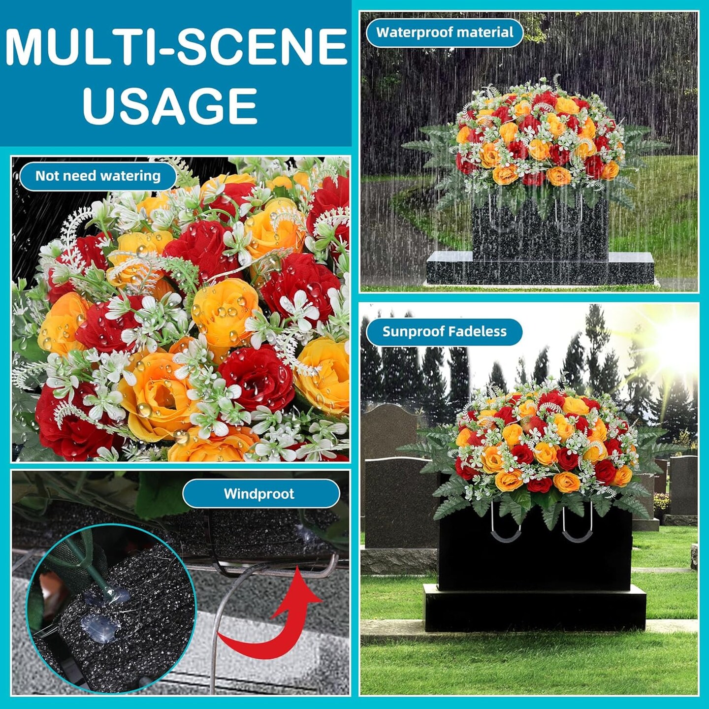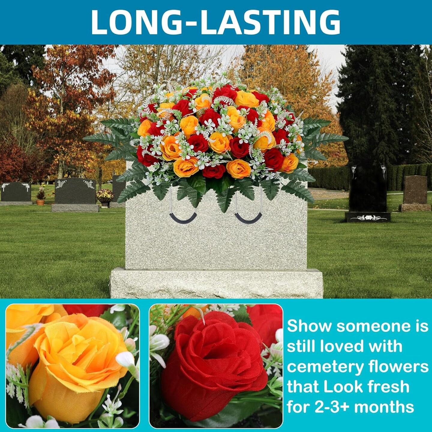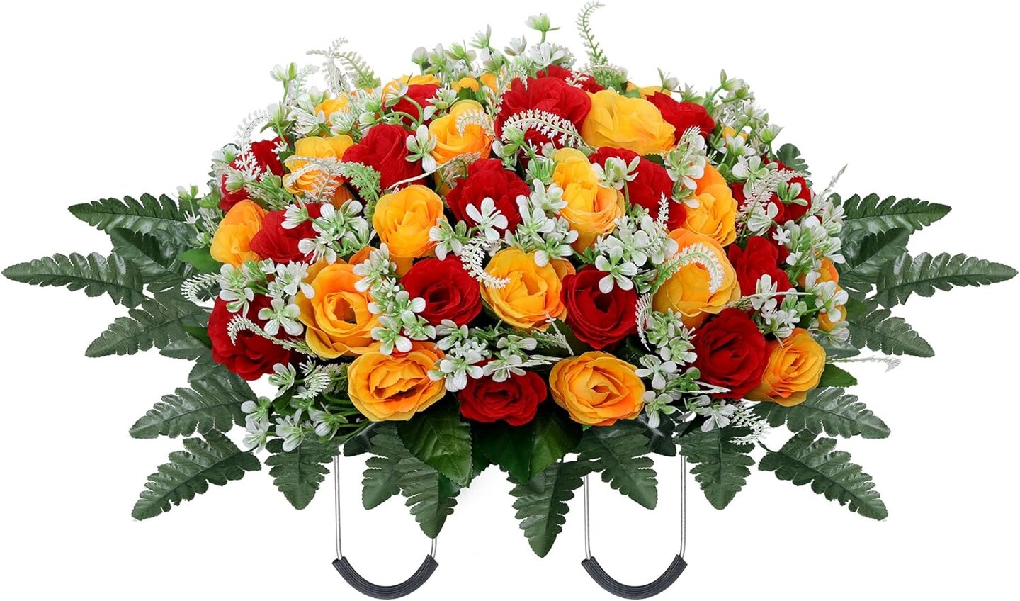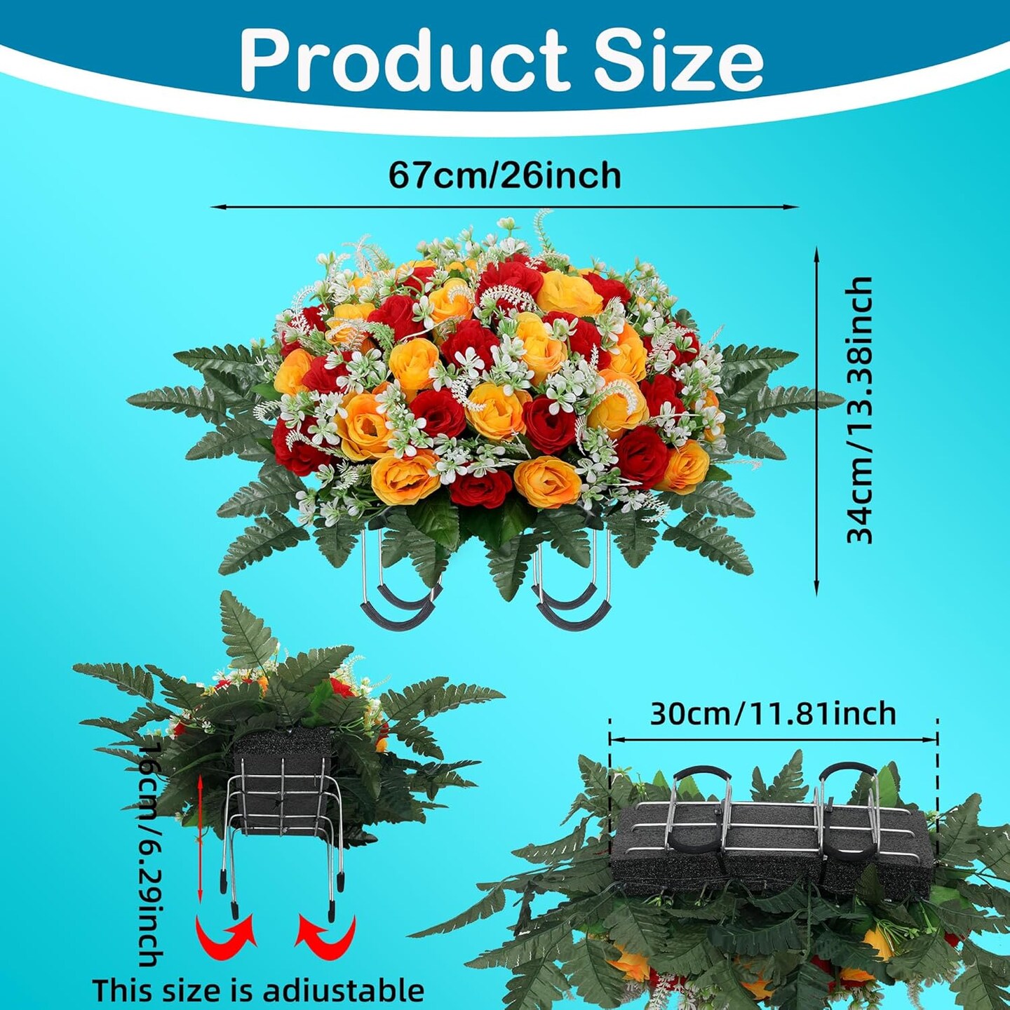 Headstone Flower Saddle – Large Artificial Cemetery Flowers for Grave, Red & Yellow Silk Roses, Outdoor Tombstone Memorial Decoration