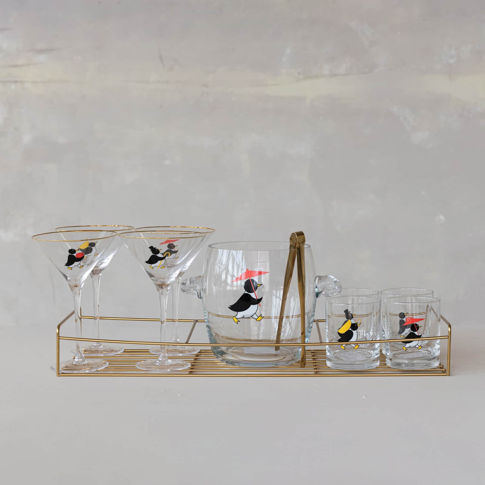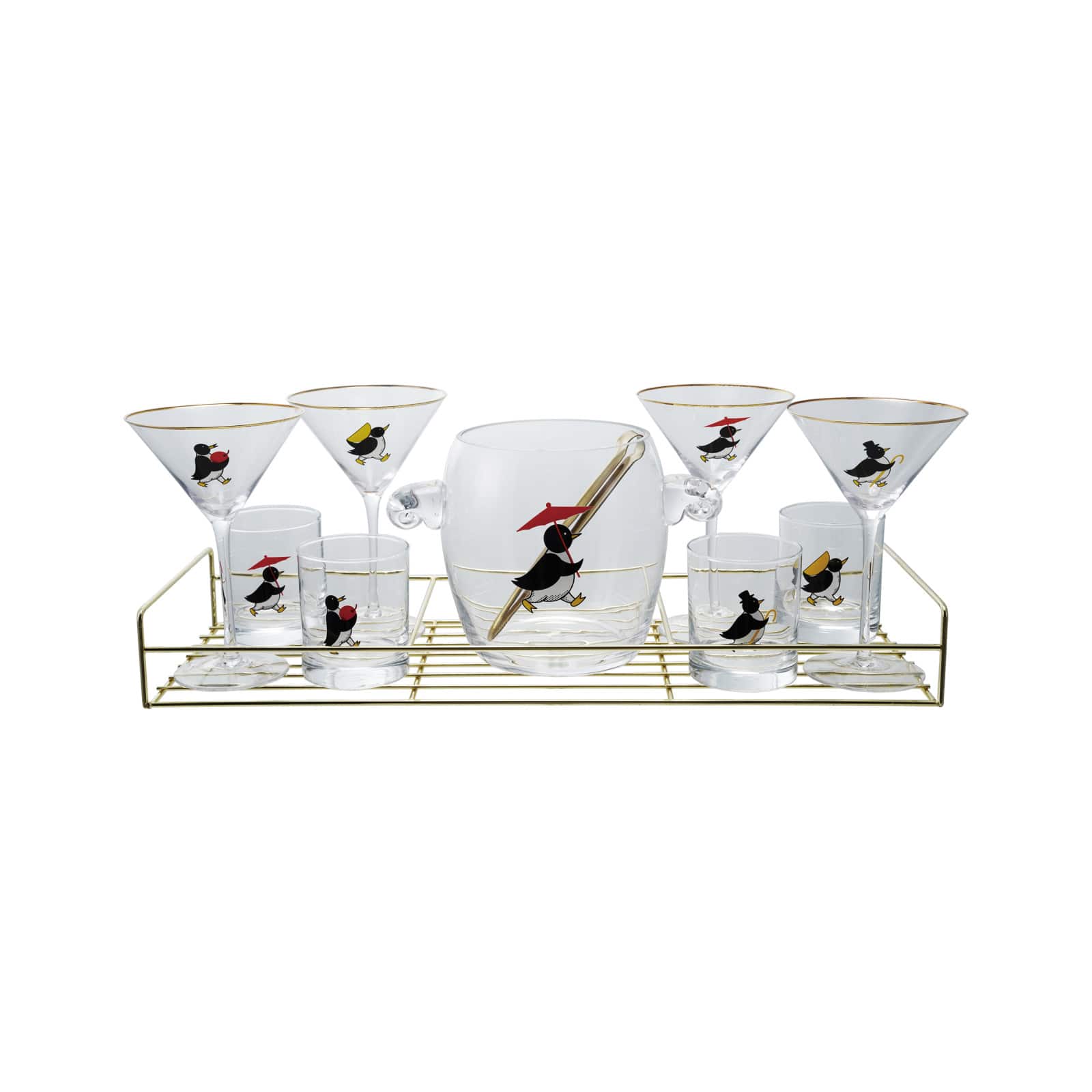 Hello Honey 11-Piece Vintage Reproduction Glass Barware Set with Penguin Decal, Gold Finish