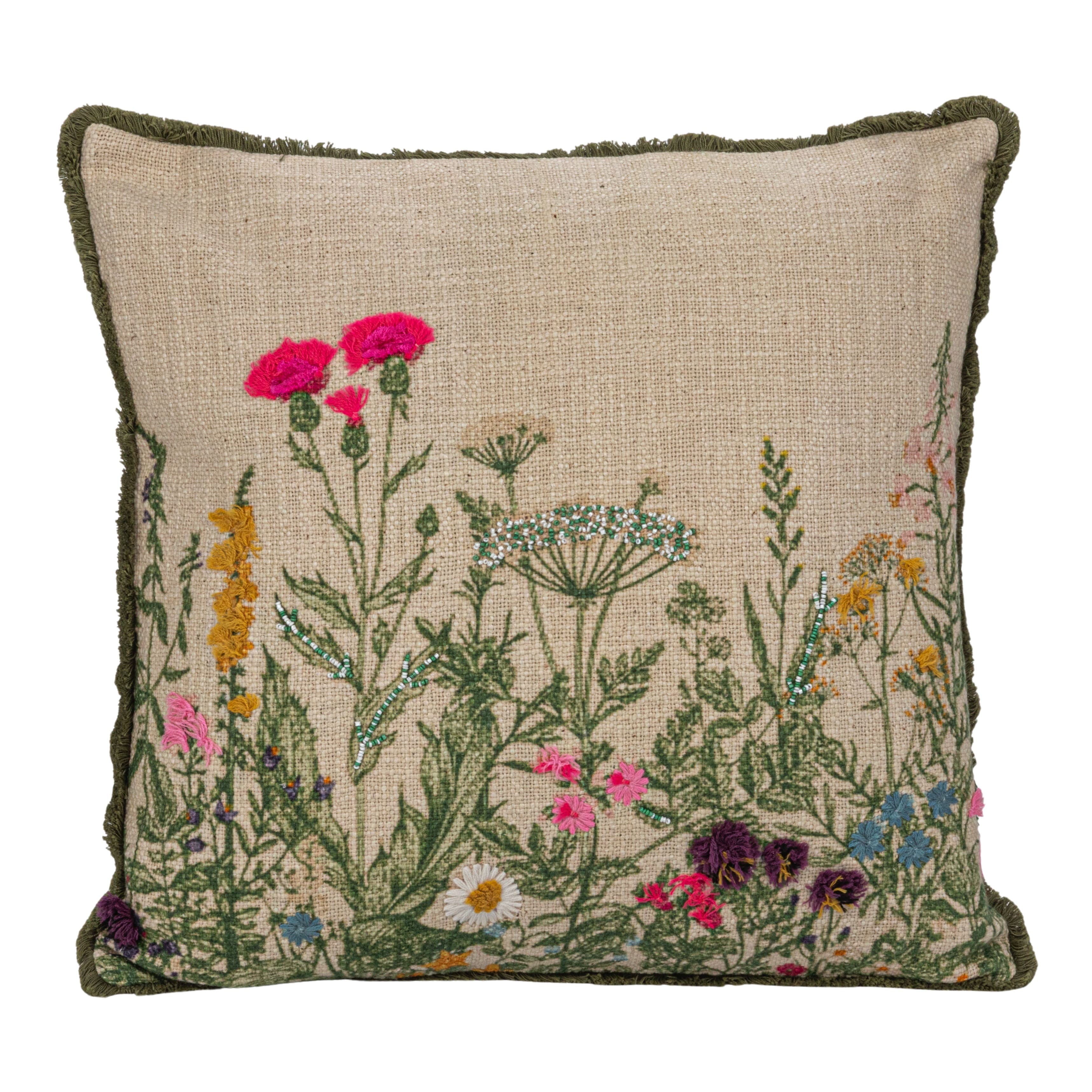 Hello Honey® 18" Multicolor Flower Embroidery, Beads & Lace Trim Cotton Slub Pillow