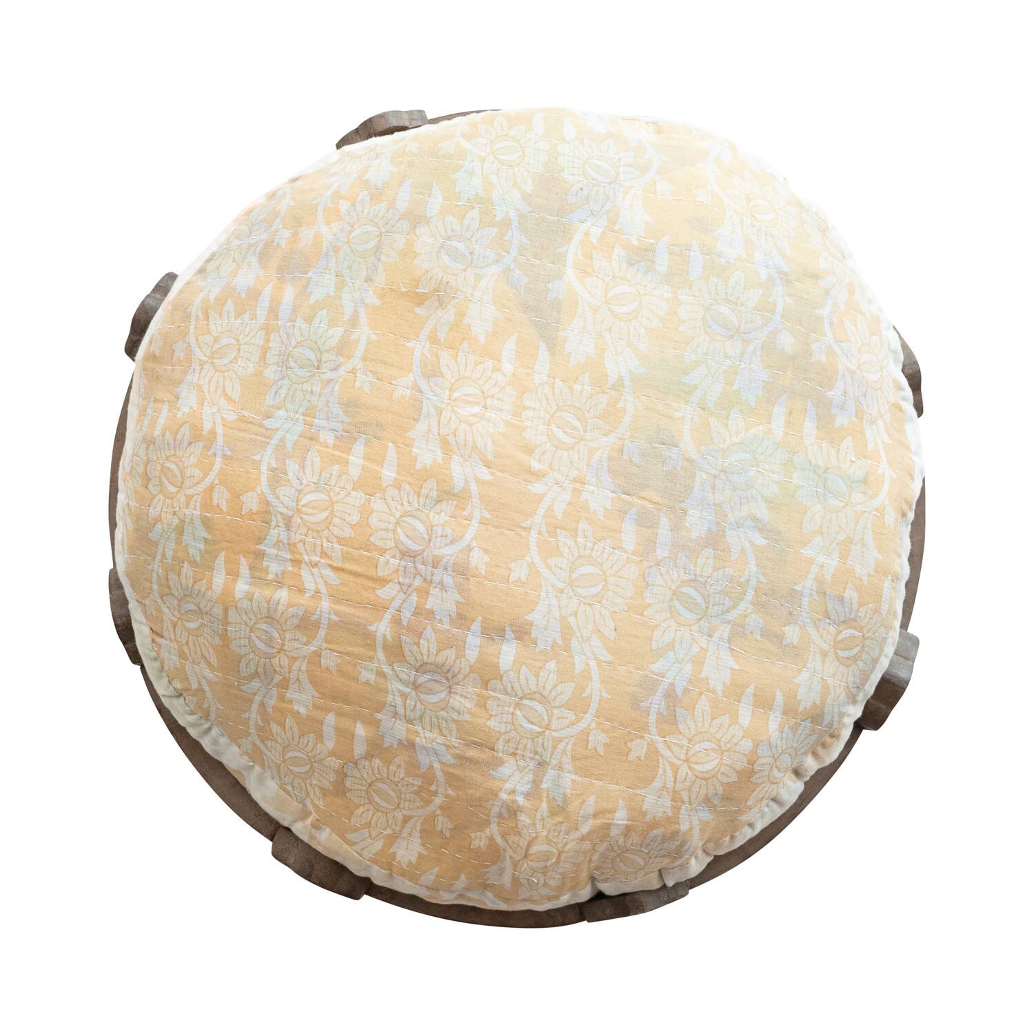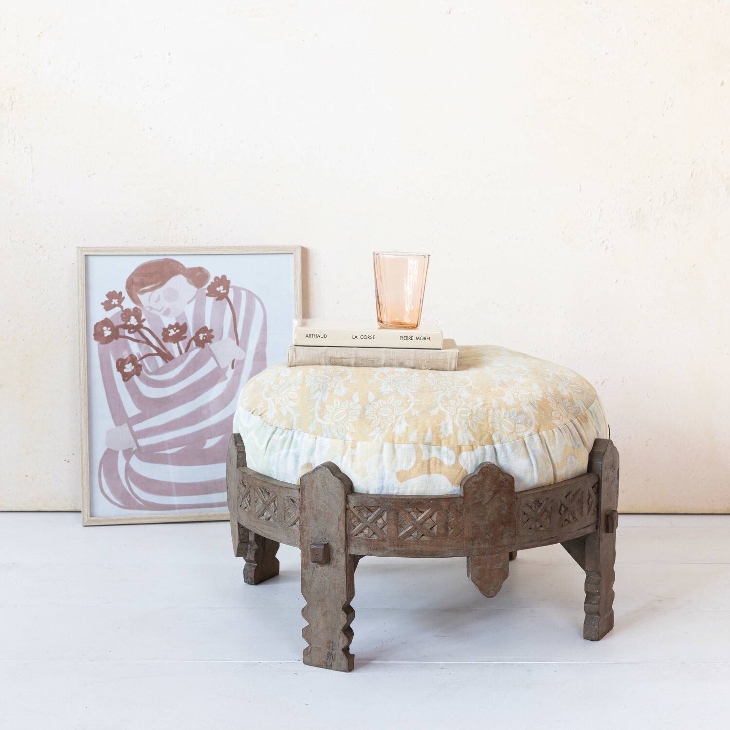 Hello Honey® 24" Carved Reclaimed Wood Stool with Bleached Vintage Cotton Kantha Patchwork Cushion